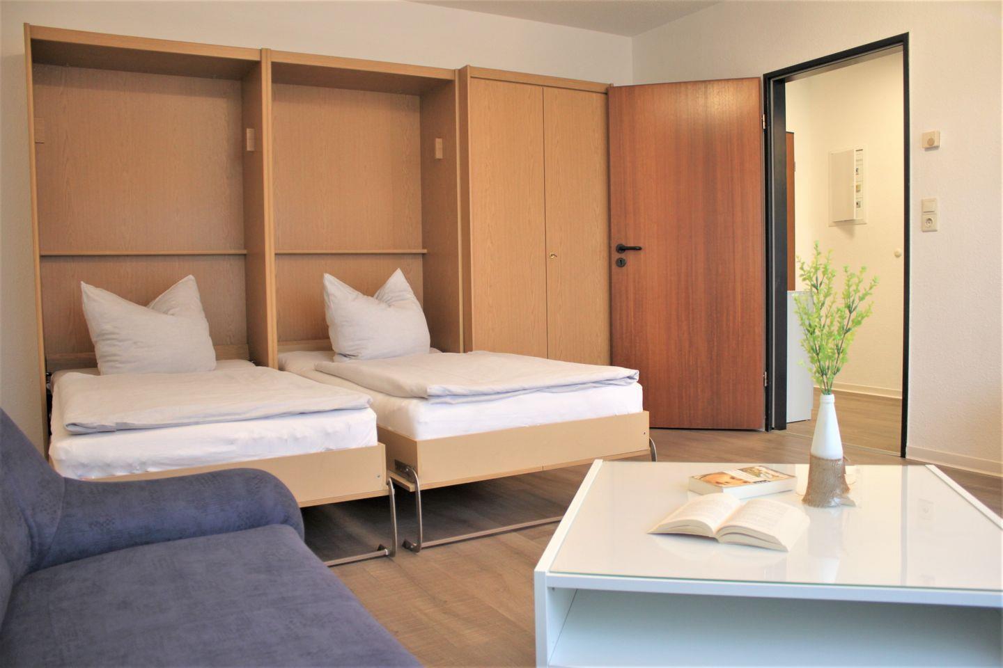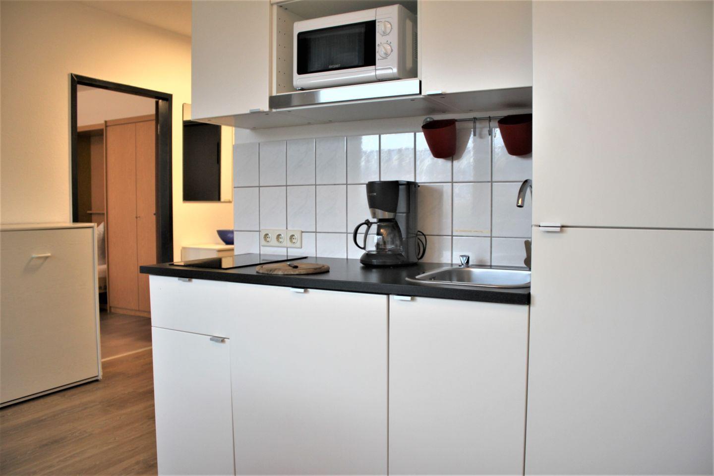 Gemütliches 1-Zimmer-Appartement für bis zu 3 Personen in Gollwitz auf Poel unweit des Strandes. Ein separates Wohn- und Schlafzimmer bietet Ihnen ein Sofa, TV-Gerät und WLAN. Außerdem befinden sich hier zwei Einzelbetten (Schrankbetten) und ein Kleiderschrank für Ihre Garderobe. Ein weiteres Einzelbett (Schrankbett) ist im kombinierten Küchen/Eingangsbereich verfügbar. Die Küche ist offen gestaltet und bietet eine moderne Küchenzeile mit guter Ausstattung und Esstisch für drei Personen.
