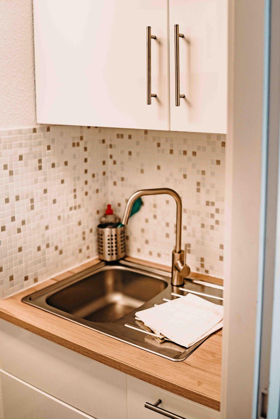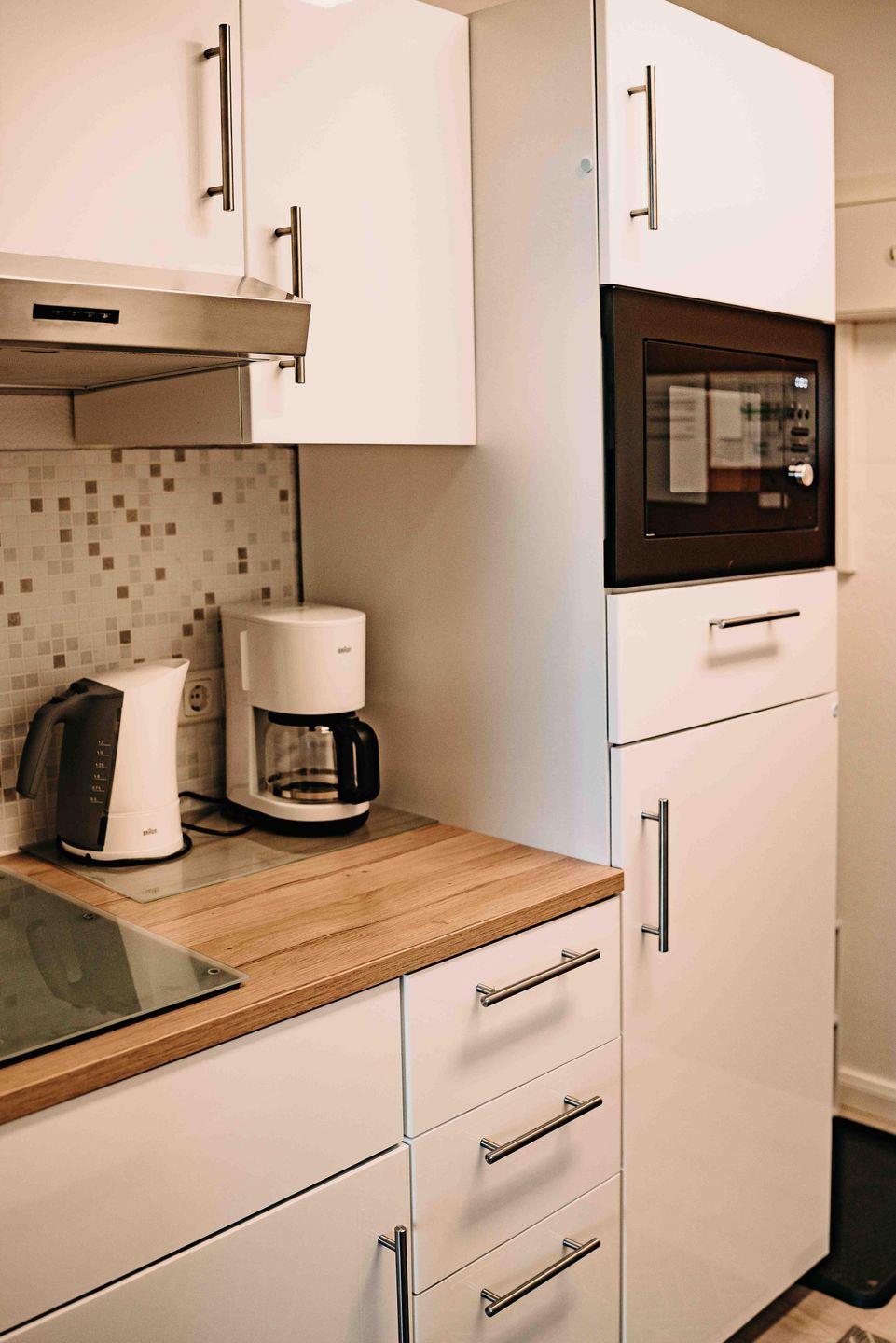 -Pantryküche inkl. 2-Plattenherd, Kühlschrank, Wasserkocher, Kaffeemaschine, Toaster