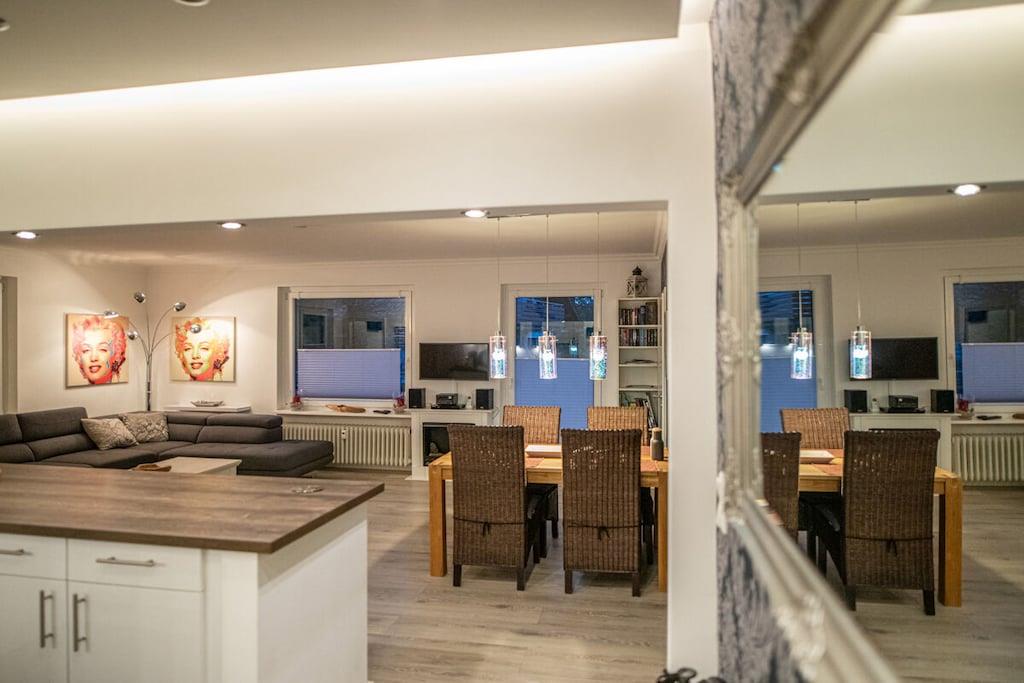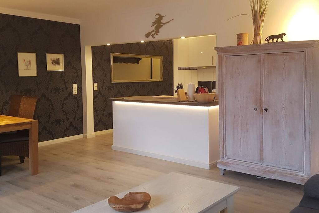 Unsere Ferienwohnung Hexenglück liegt im 1. Obergeschoss und mitten im Herzen von Hahnenklee mit wunderschönem Blick auf den Kranichsee. Direkt daneben befindet sich unsere 2. Ferienwohnung Hexenzauber Hahnenklee, die mit einer schalldichten Zwischentür verbunden ist. Bei Bedarf, zB 2 Familien, können Sie diese dazu mieten. Sie bekommen dann den Schlüssel. Wir haben die Wohnung individuell eingerichtet, so dass Sie sich wie zu Hause fühlen. Indirekte Beleuchtung mit vielen Möglichkeiten runden das Wohlfühlerlebnis ab. Eine schöne Sofaecke lädt zu Fernsehabenden ein und Sie können einen Ethanolkamin anzünden für gemütliche Winterstimmung. Die Küche hat einen grossen Küchentresen und sie haben einen wunderschönen Blick auf den See. Im Schlafzimmer finden Sie ein gemütliches Doppelbett und einen grossen Kleiderschrank. Parkplätze sind im Hof vorhanden.