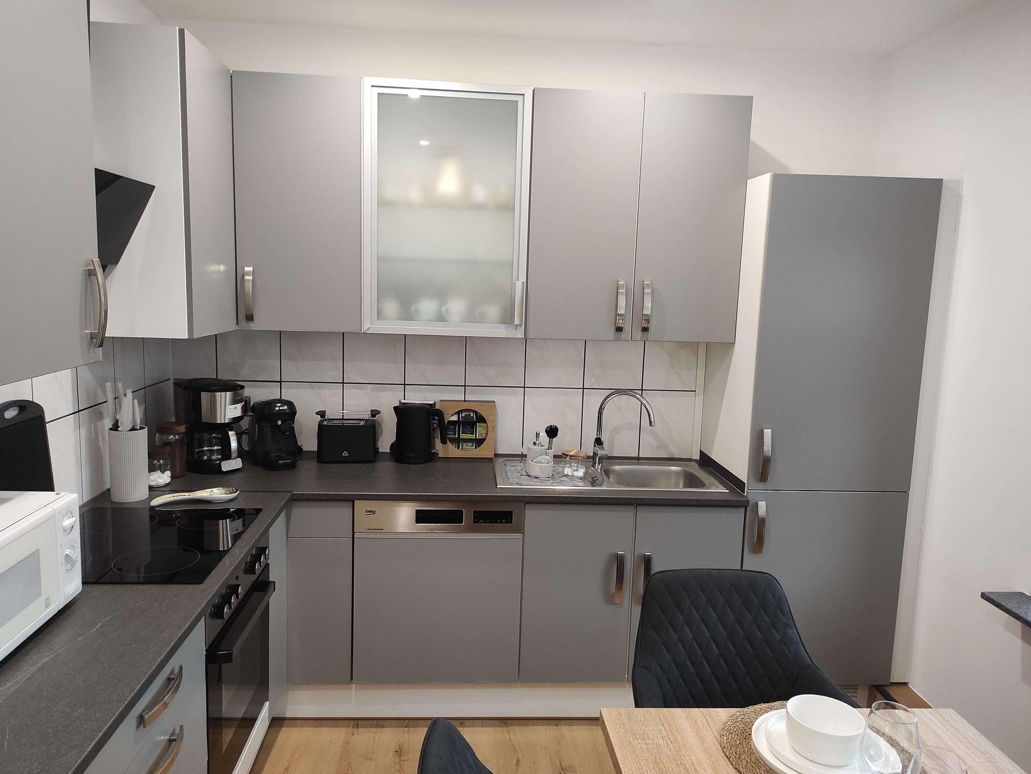 • ?????Voll ausgestattete Küche mit Geschirrspüler, großem Kühlschrank und Backofen