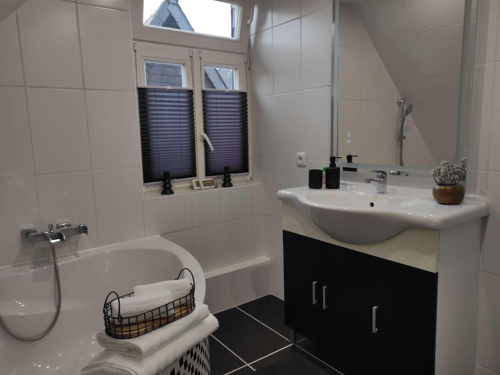• ?????Zwei moderne Badezimmer (1 × Dusche, 1 × Badewanne), jeweils mit Haartrockner