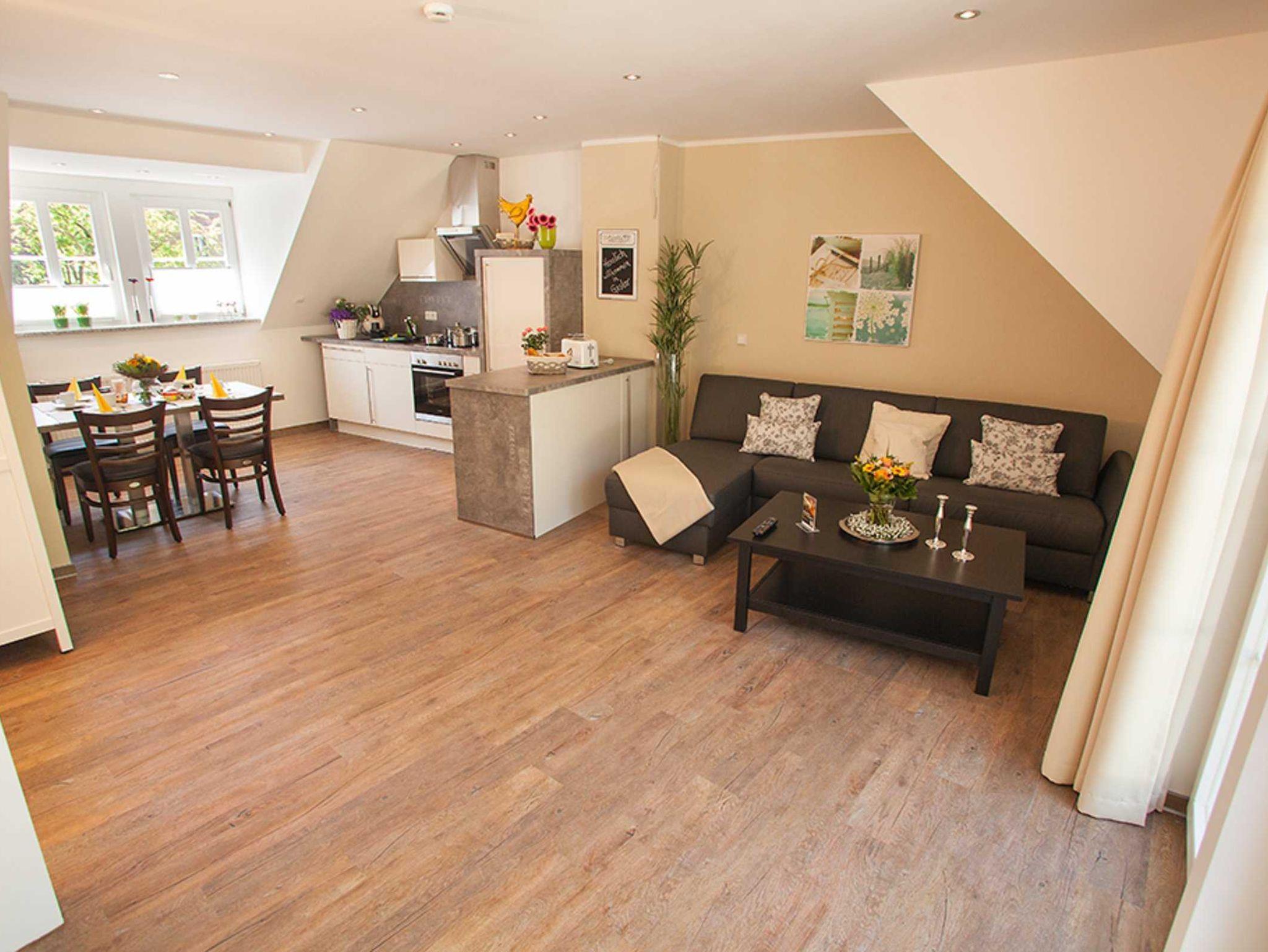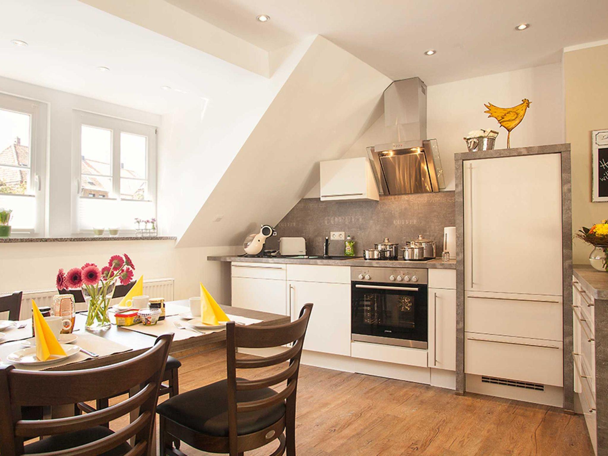 Die geräumige Nordberg-Ferienwohnung liegt im 1. OG und bietet auf 58 m² Platz für die ganze Familie. Neben dem Schlafzimmer mit Boxspringbetten für zwei Personen bietet die Schlaf-Couch im Wohnzimmer bequeme Schlafmöglichkeit für bis zu zwei weitere Personen. Im offenen, modernen Wohn-Ess-Kochbereich verbringen Sie entspannte und gesellige Stunden. Das Bad verfügt über eine individuell steuerbare Fußbodenheizung und einen Kosmetikspiegel. Das Schmuckstück der Nordberg-Ferienwohnung ist die 40m² grosse Dachterrasse! Von hier blicken Sie nicht nur auf die gepflegte Gartenanlage, sondern Sie haben auch direkten Zugang zum Garten. Ob Sie den Tag mit einem Frühstück im Freien beginnen, die Nachmittagssonne genießen oder den Abend bei einem Glas Wein gemütlich ausklingen lassen: Hier entsteht inmitten der Goslarer Altstadt wahres Urlaubs-Feeling.