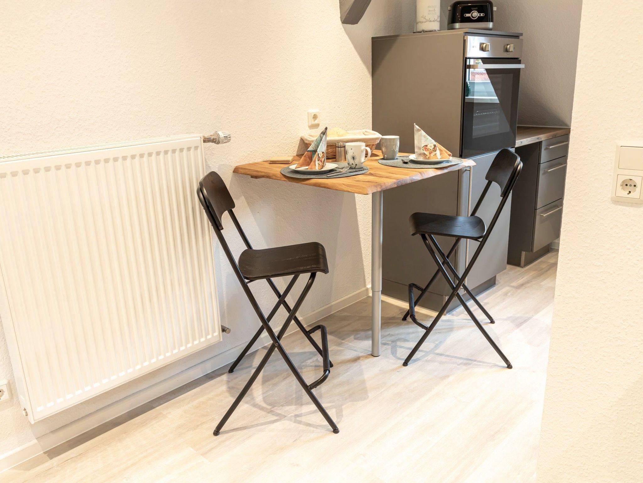 Dukatenzimmer Appartement mit einem Zimmer und offener Küche 33qm mit Blick über die Goslarer Altstadt. 2. Obergeschoss. Ein Duschbad mit Kopf- und Handbrause. Boxspringbett 180x200 cm mit Bettwäsche 155x220 cm.