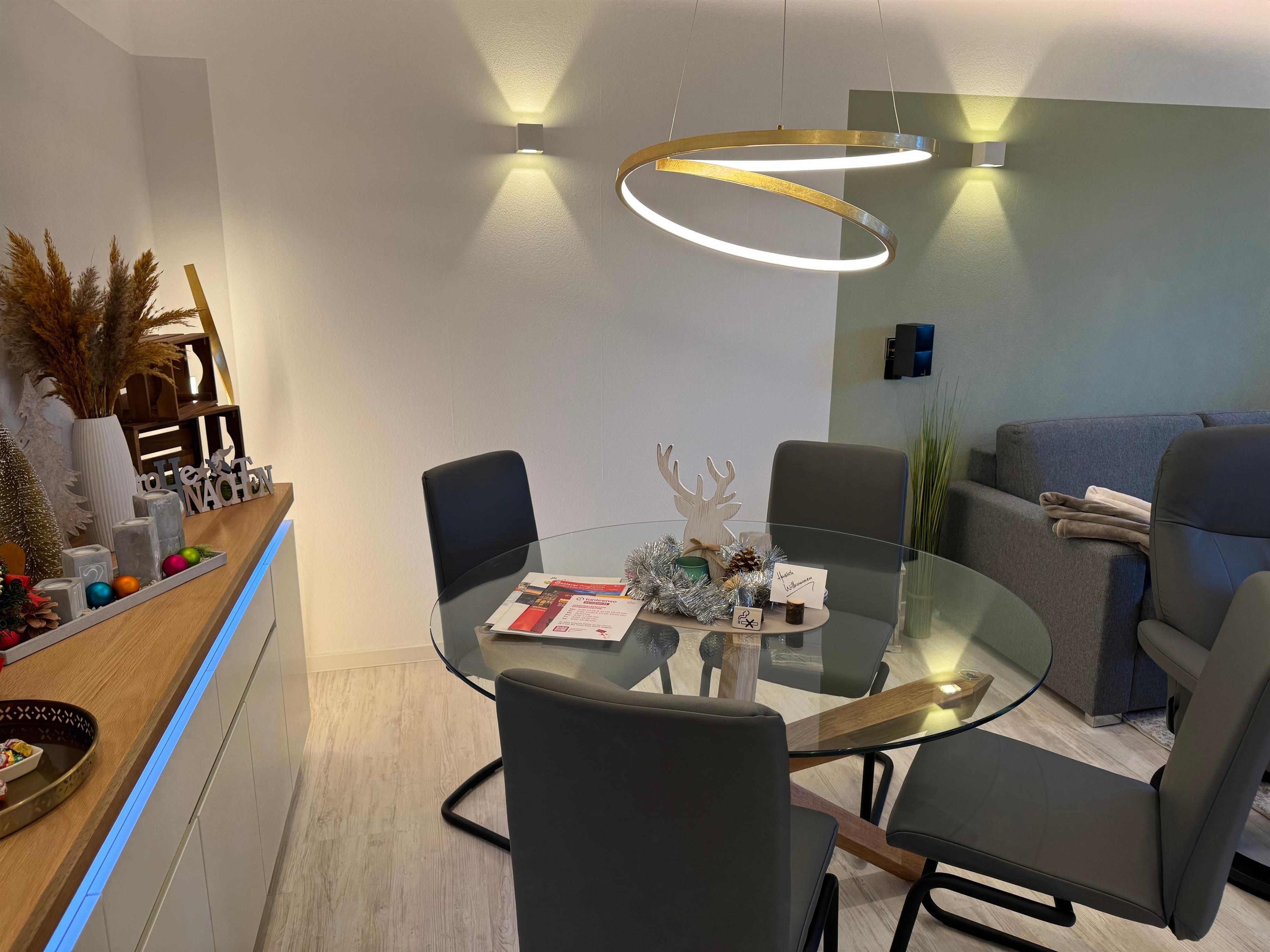 großer Esstisch mit vier Stressless-Relaxstühlen, auch als HomeOffice-Arbeitsplatz geeignet