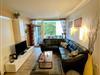 Wohnzimmer mit schwarzem Ledersofa, für eine 5. Person kann das Sofa ausgezogen werden