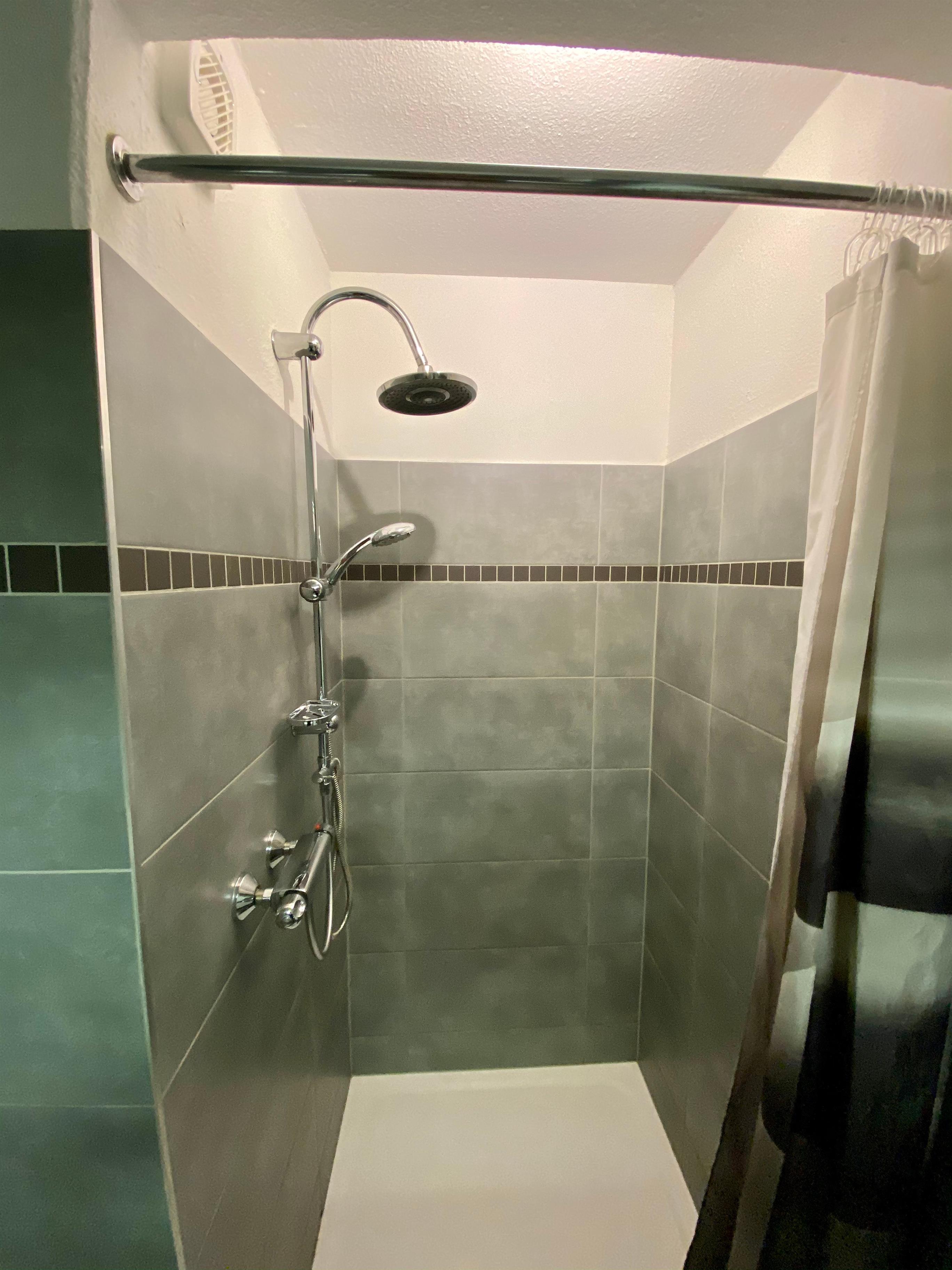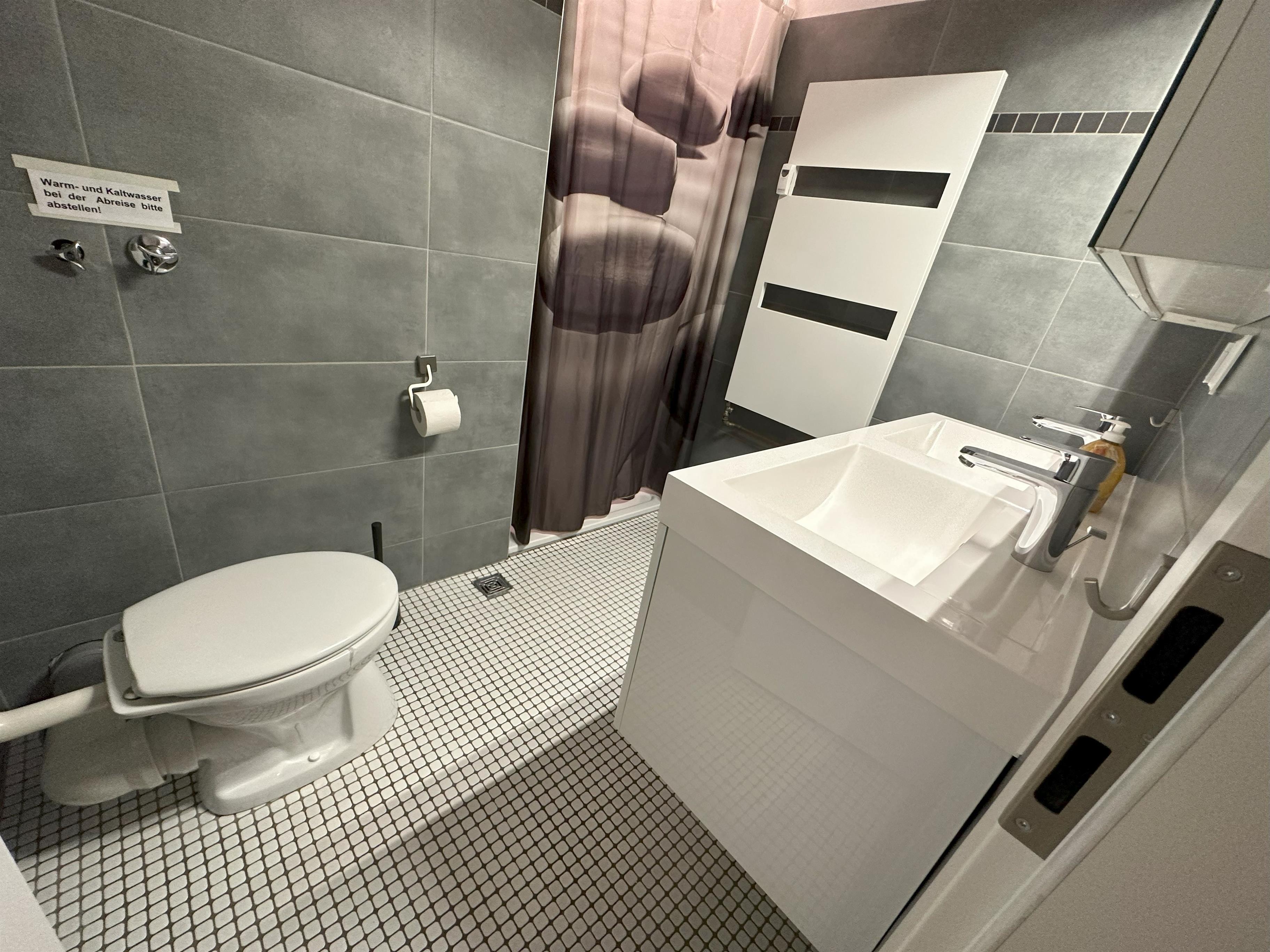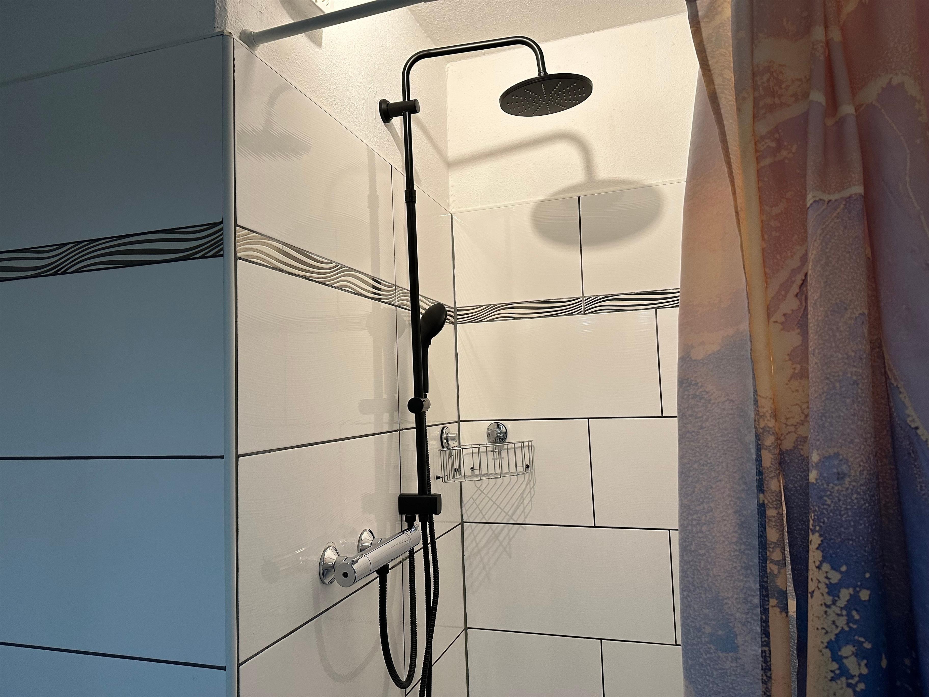 2. Sanitärraum mit Toilette, ebenerdiger großer Dusche, Thermostat und Handtuchheizkörper