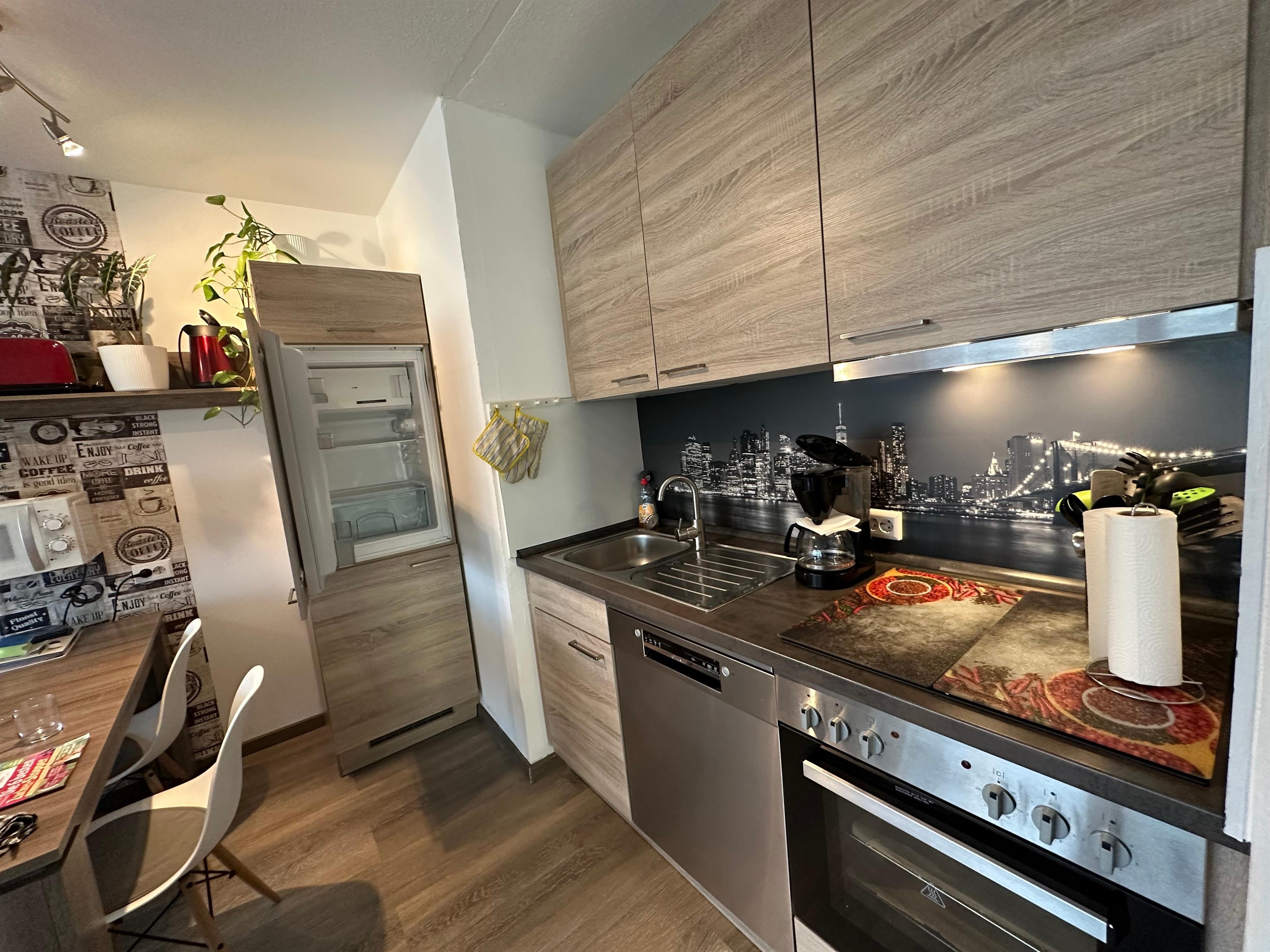 Gepflegte Küchenzeile mit Herd u.Backofen,gut ausgestattet mit vielen E-Geräten,Kühlschrank mit Eisfach, Geschirrspüler