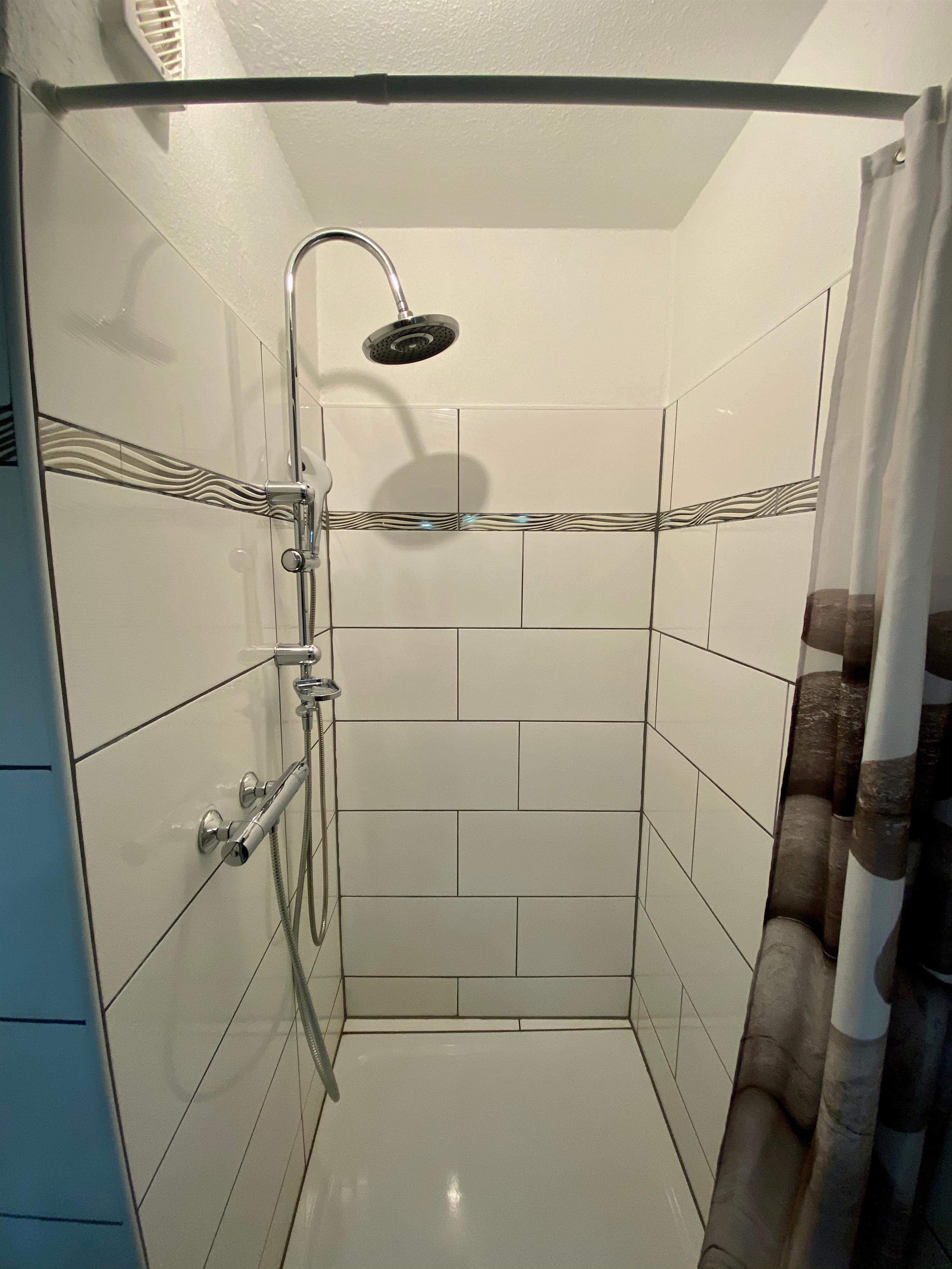 1. Sanitärraum mit Dusche, Toilette und Doppelwaschbecken, Regendusche, Thermostat, Handtuchheizkörper