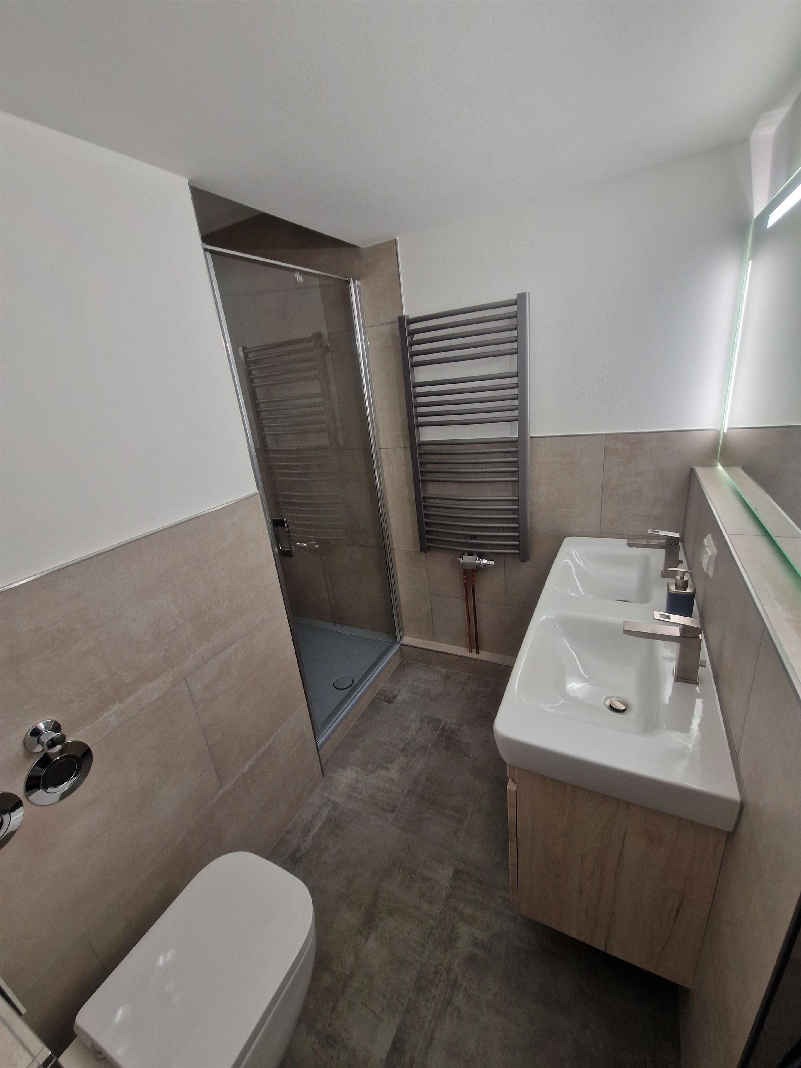 Das Haupt-Badezimmer ist mit einer großen (Regen-)Dusche, einem Doppelwaschbecken, WC und Handtuchheizkörper ausgestattet. Darüber hinaus gibt es noch ein weiteres, kleines Badezimmer mit WC und Waschbecken.