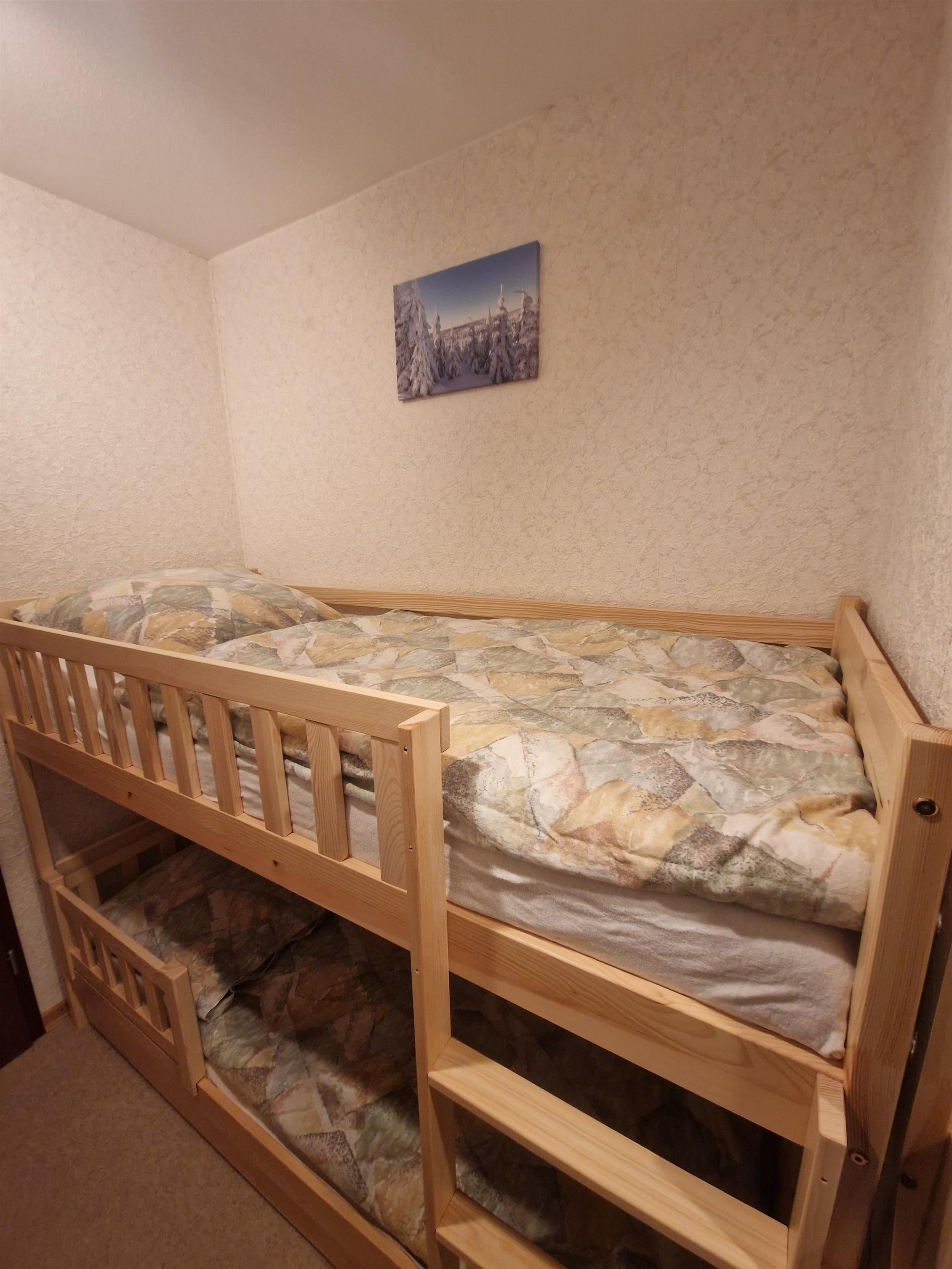 Es gibt drei Schlafzimmer: Eines mit einem Boxspring-Doppelbett (140x200cm), eines mit zwei Einzelbetten (90x200cm) und eines mit einem Etagenbett (80x190cm). Sowohl das Doppelbett als auch das Etagenbett wurden im Juli 2025 angeschafft und sind ebenso wie die Matratzen komplett neu.