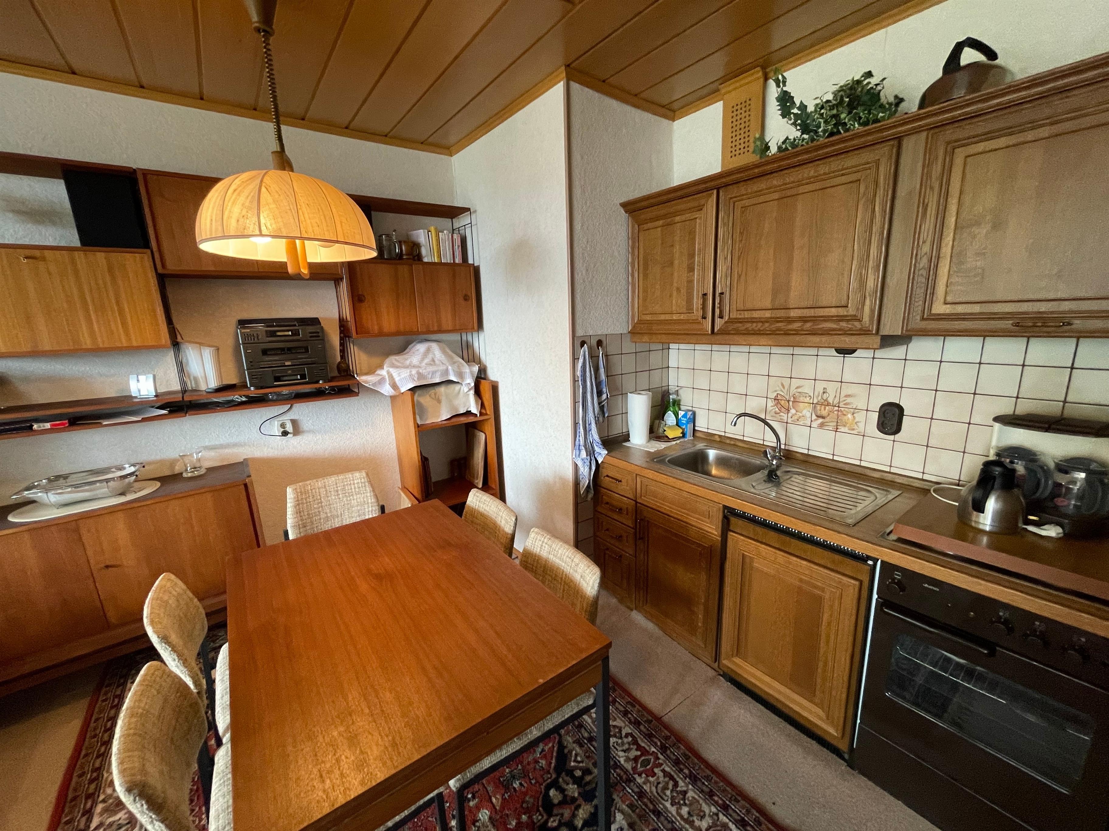 Sie verfügt über ein großes Wohnzimmer mit einer dänischen Sitzgarnitur, die wir im Dezember 2024 für Sie komplett erneuern lassen haben, sowie über einen Smart-TV, Essbereich und Küchenzeile, die zum Zubereiten der Selbstverpflegung alles Notwendige beinhaltet. Im Wohnzimmerschrank sind zudem einige Karten- und Brettspiele für Spieleabende vorhanden.