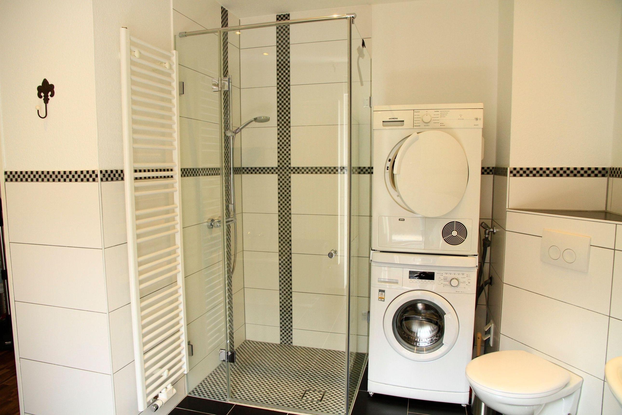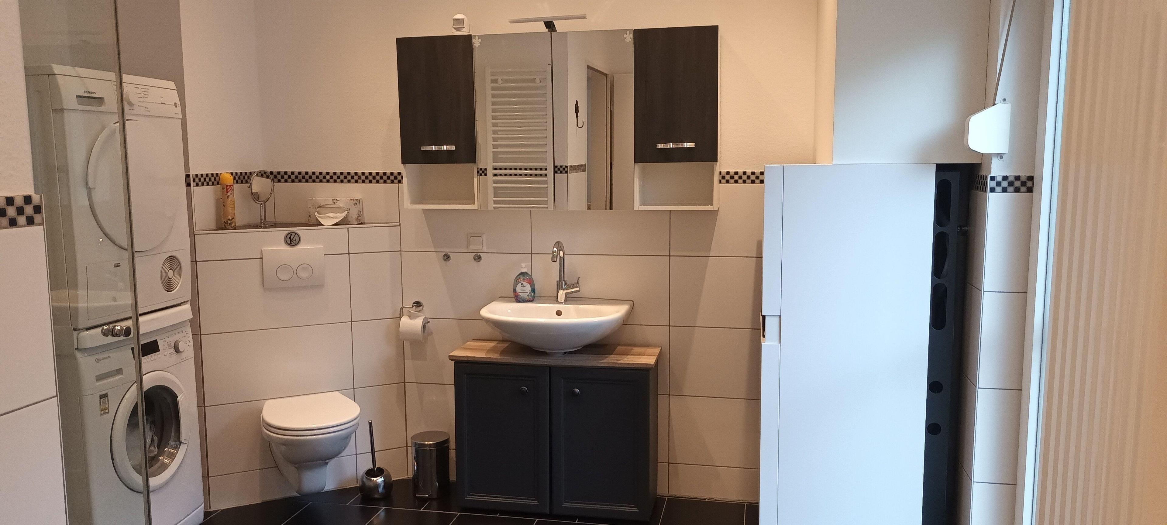 Ausgestattet mit Badewanne und ebenerdige Dusche, Fön, Waschmaschine und Wäschetrockner.