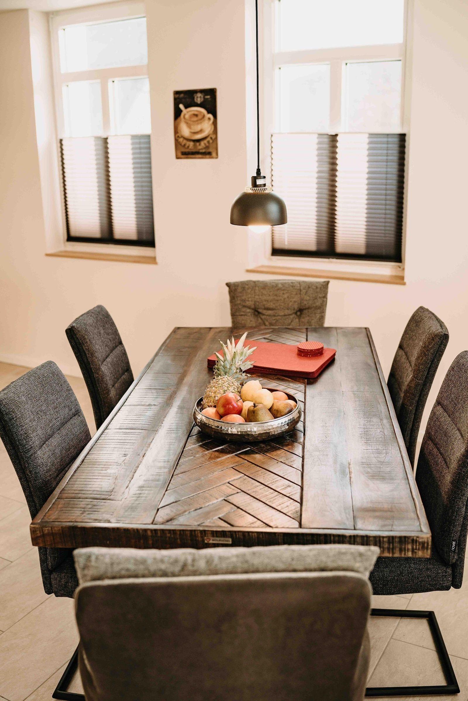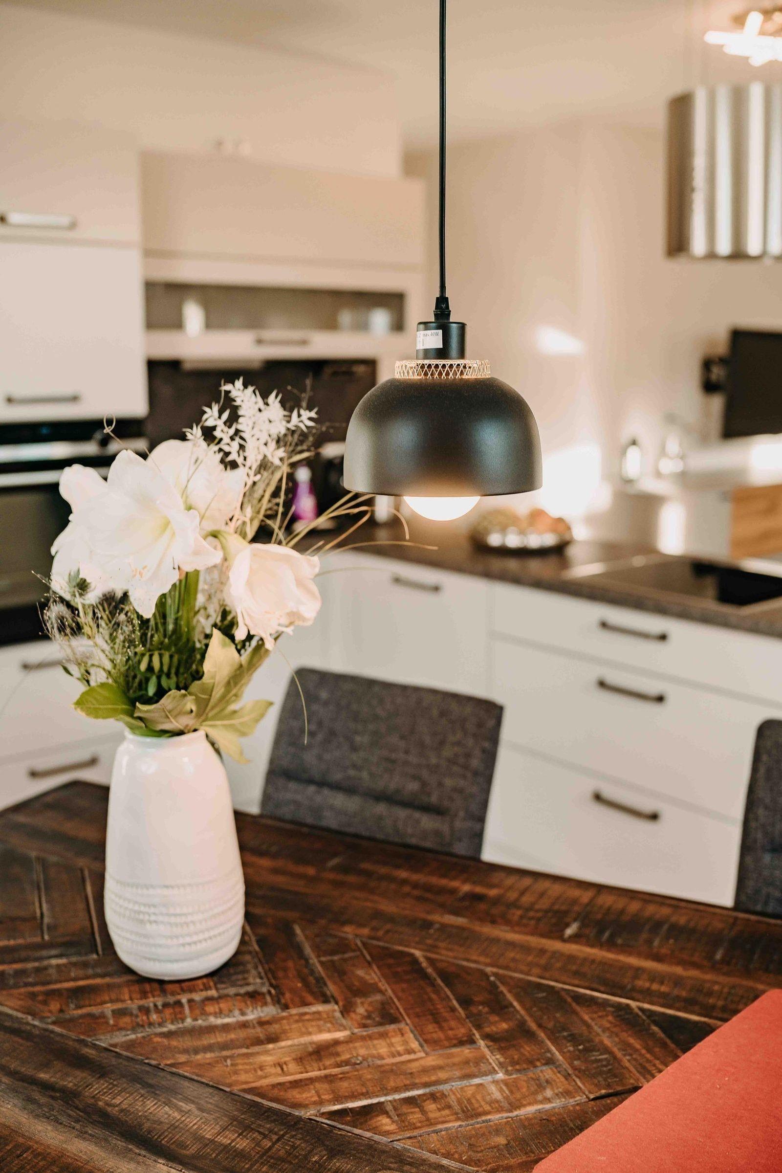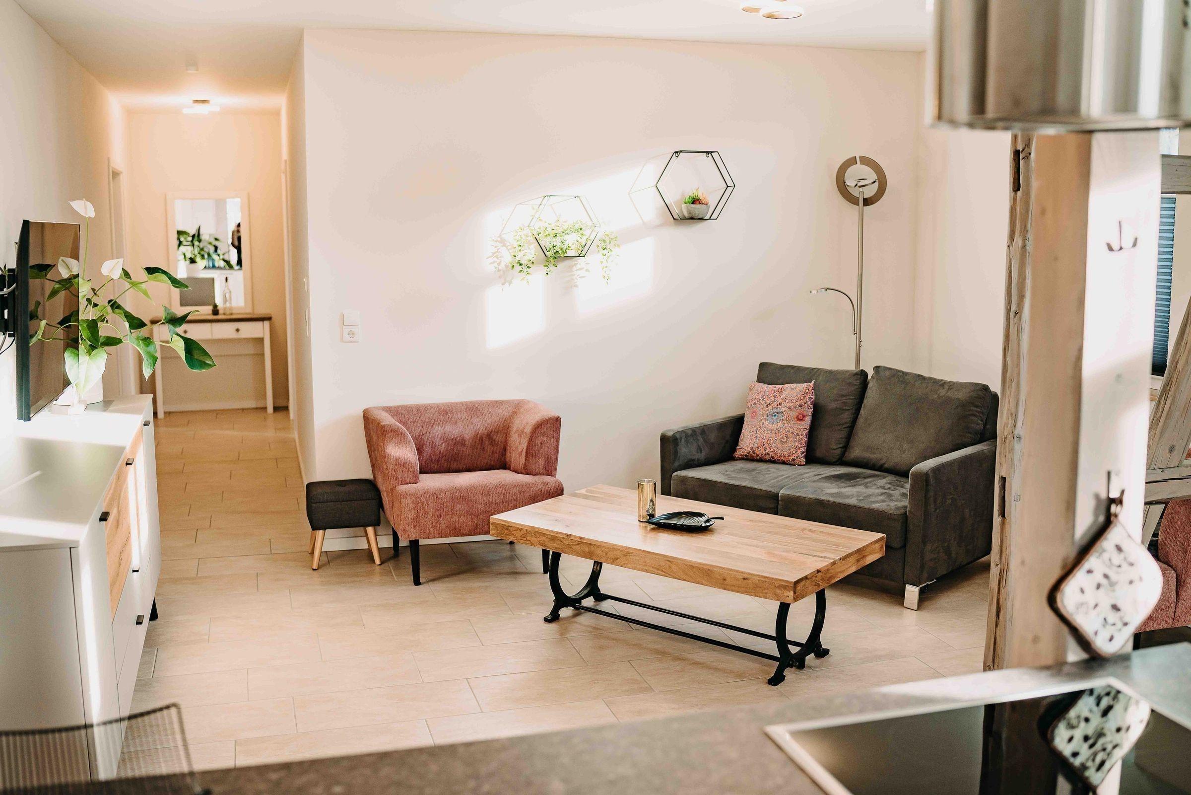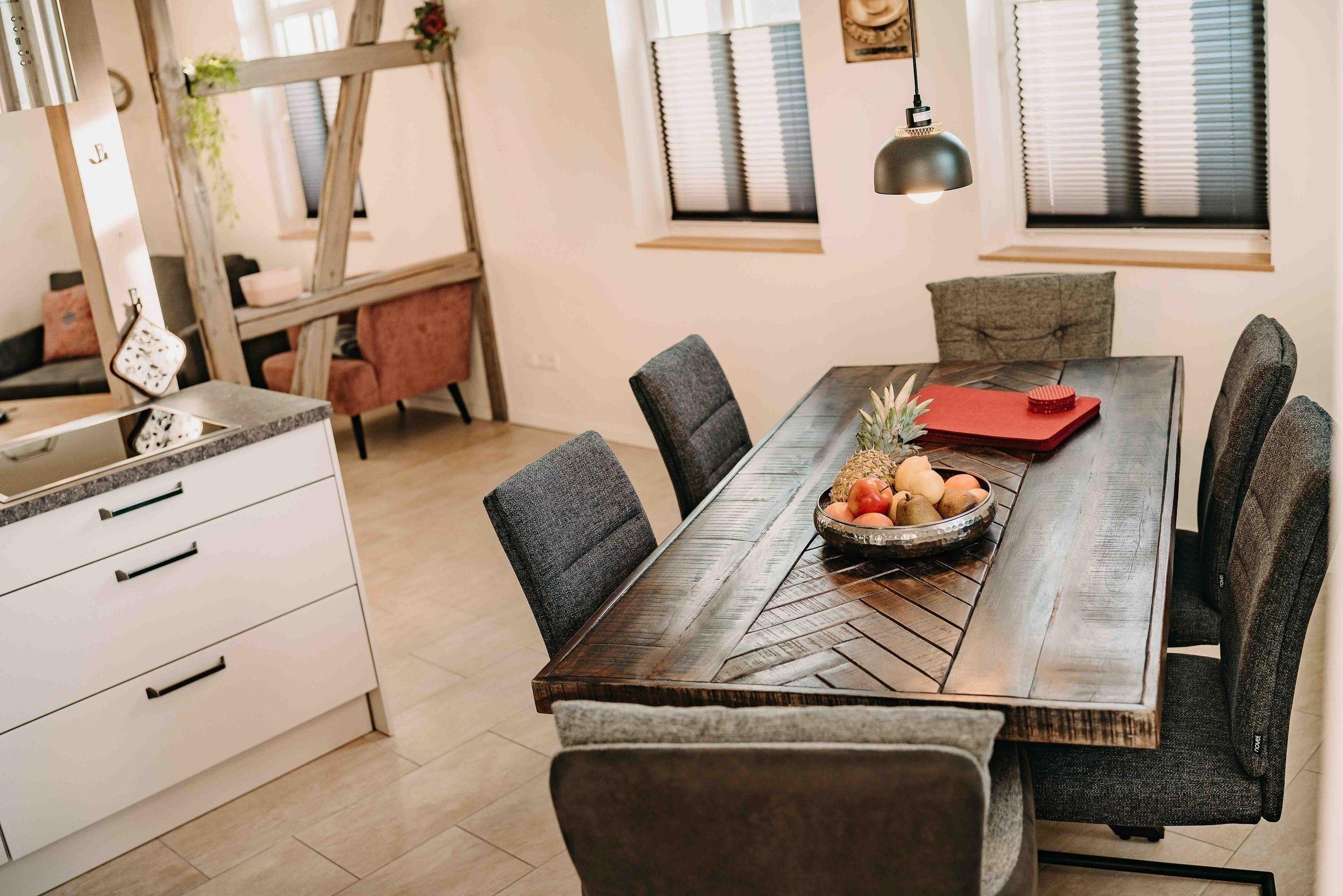 Die Ferienwohnung bietet eine stilvolle und gut durchdachte Ausstattung, die den Aufenthalt für jeden Gast angenehm gestaltet. Der offene Küchenbereich ist mit modernen Geräten ausgestattet, darunter ein Elektro-/Gasherd, Backofen, Geschirrspüler und Kühlschrank. Eine Mikrowelle und Kaffeemaschine stehen ebenfalls zur Verfügung. Im Wohnschlafzimmer finden sich eine bequeme Schlafcouch sowie ein Esstisch, ideal für gesellige Abende. Es gibt zwei Schlafzimmer, eines mit einem Doppelbett und das andere mit zwei Einzelbetten. Das Badezimmer verfügt über ein Fenster, eine Duschbadewanne sowie einen Haartrockner. Für Unterhaltung sorgt ein Fernseher. Praktische Annehmlichkeiten wie Waschmaschine, Wäschetrockner, Staubsauger und Parkplatz sind ebenso vorhanden. Zudem sorgt WLAN-Internet für eine durchgehende Verbindung. Die Wohnung ist einladend und komfortabel, perfekt für entspannte Ferien.
