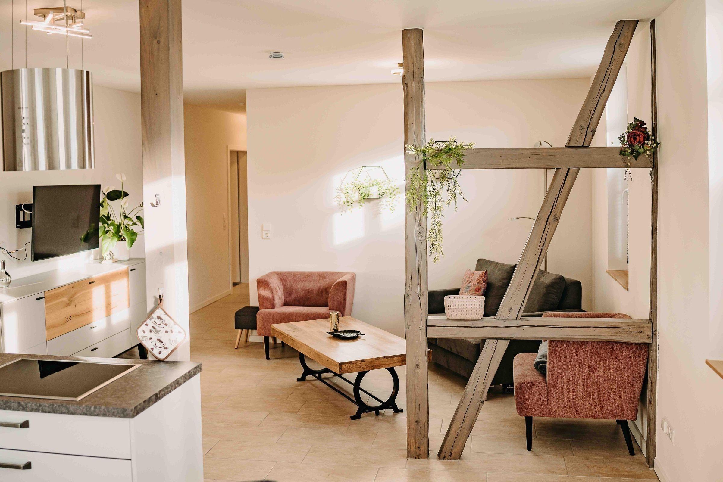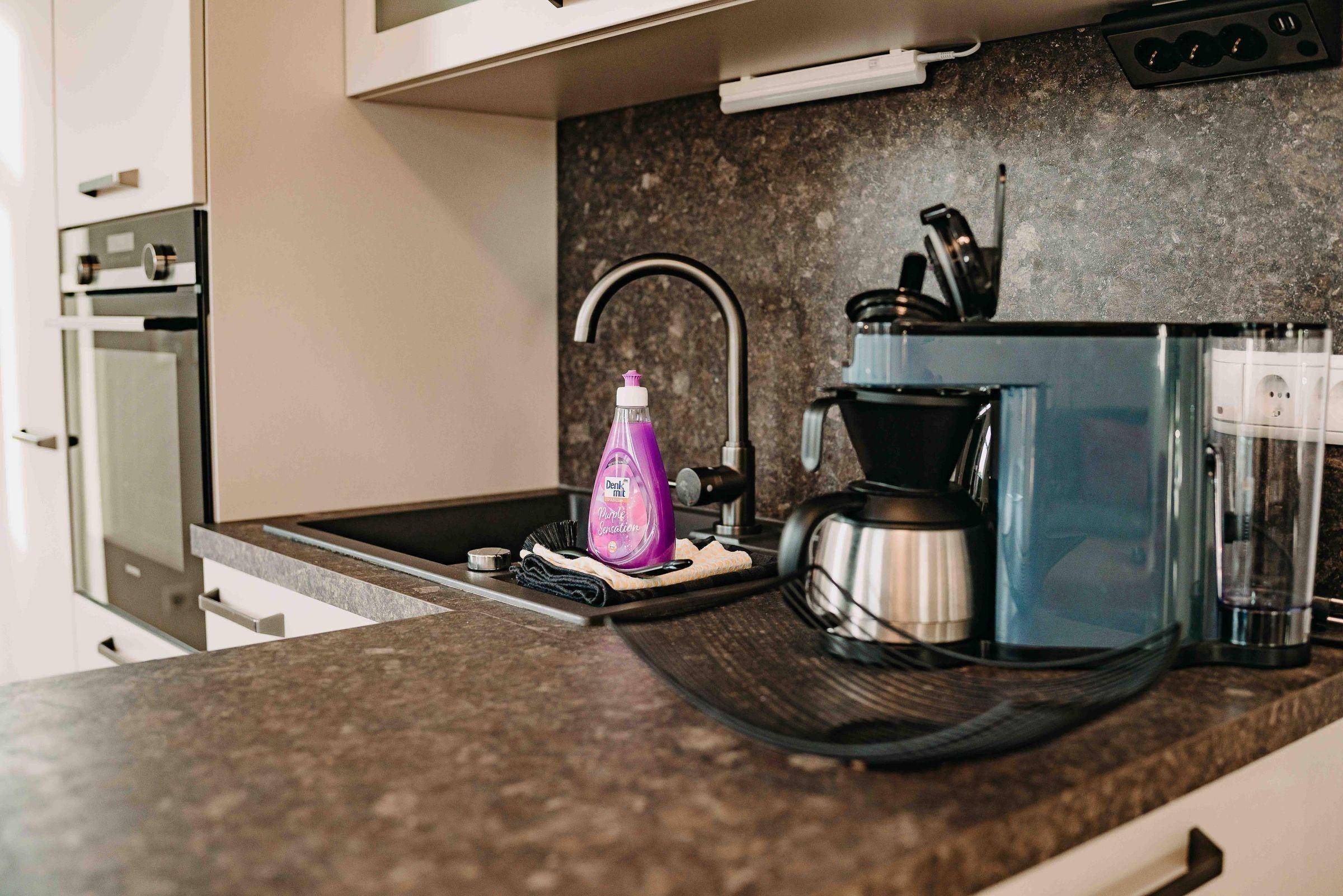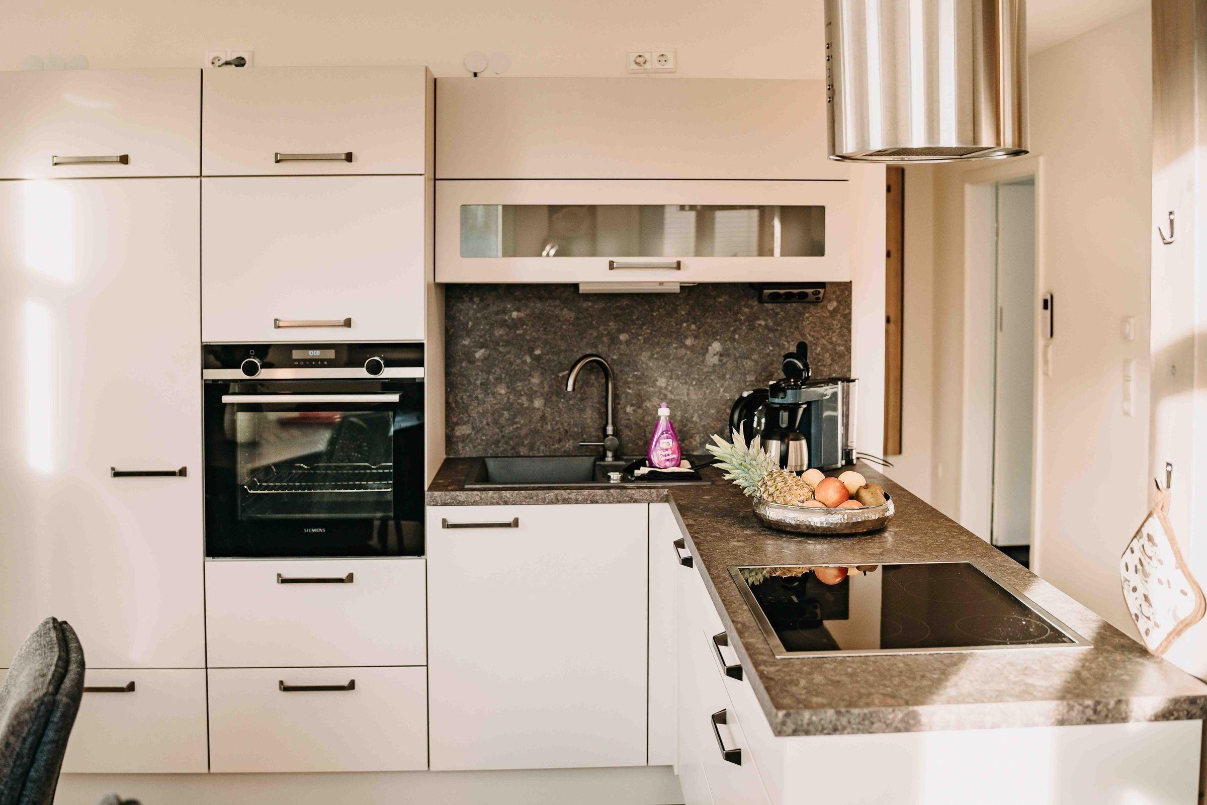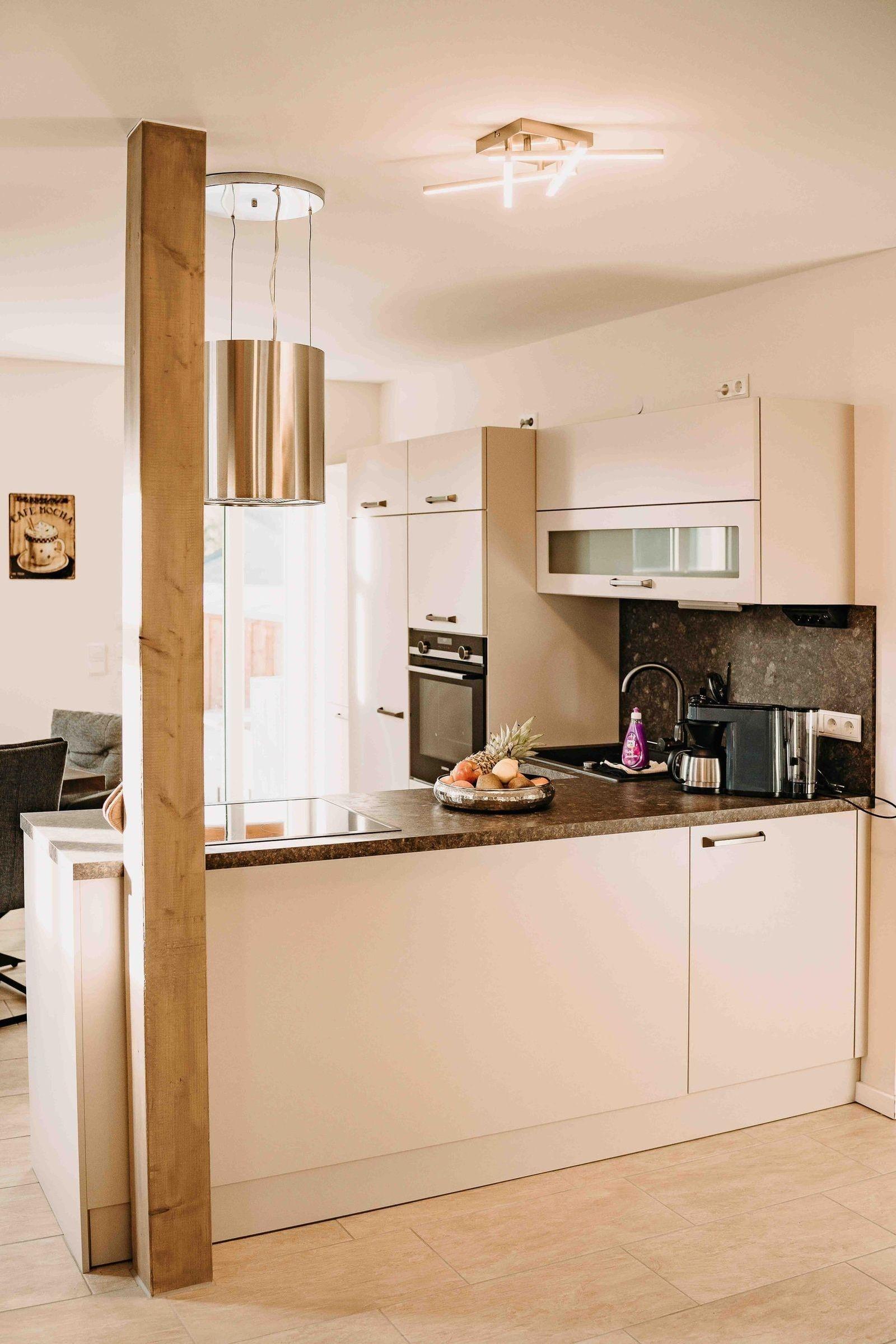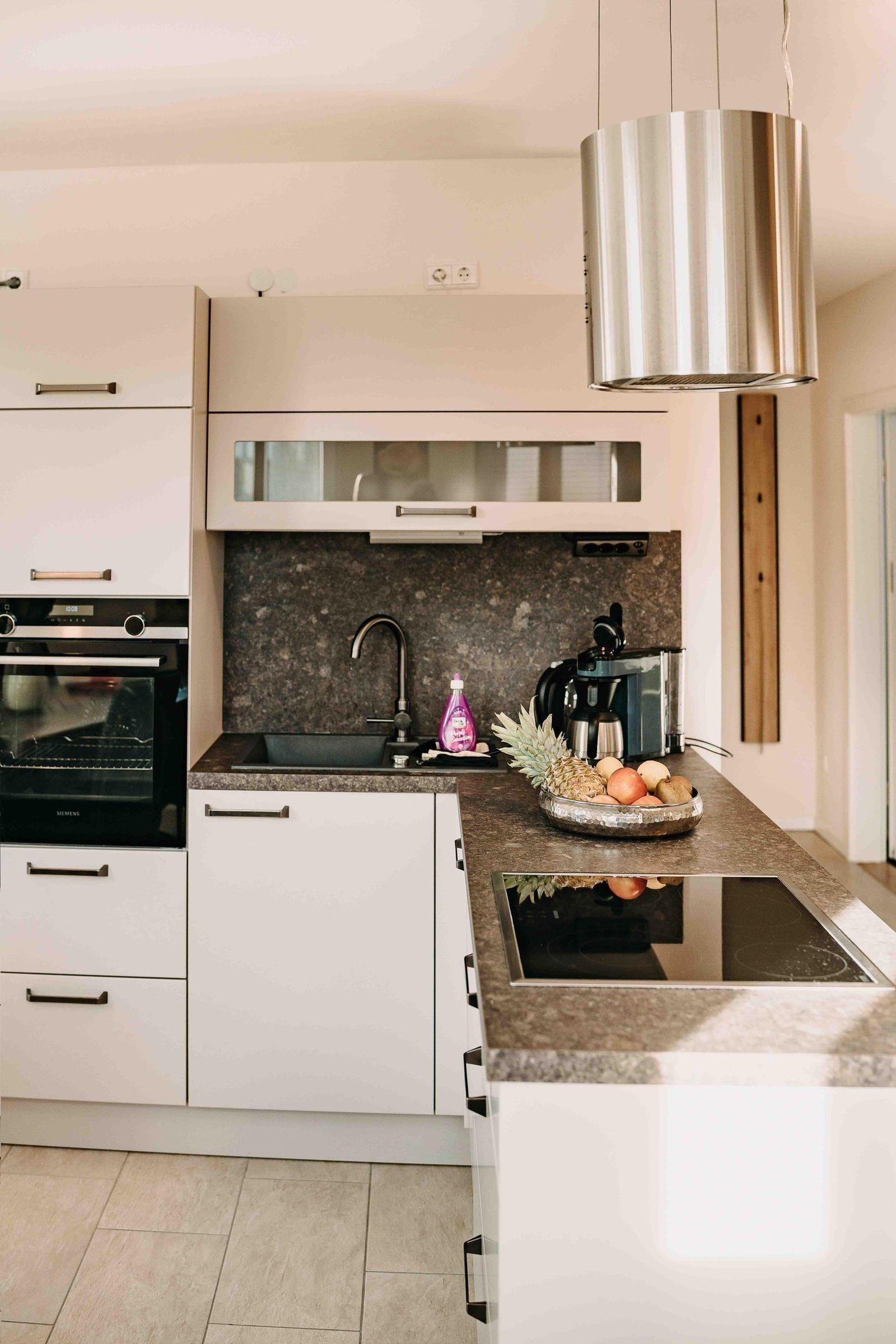 Die Ferienwohnung bietet eine stilvolle und gut durchdachte Ausstattung, die den Aufenthalt für jeden Gast angenehm gestaltet. Der offene Küchenbereich ist mit modernen Geräten ausgestattet, darunter ein Elektro-/Gasherd, Backofen, Geschirrspüler und Kühlschrank. Eine Mikrowelle und Kaffeemaschine stehen ebenfalls zur Verfügung. Im Wohnschlafzimmer finden sich eine bequeme Schlafcouch sowie ein Esstisch, ideal für gesellige Abende. Es gibt zwei Schlafzimmer, eines mit einem Doppelbett und das andere mit zwei Einzelbetten. Das Badezimmer verfügt über ein Fenster, eine Duschbadewanne sowie einen Haartrockner. Für Unterhaltung sorgt ein Fernseher. Praktische Annehmlichkeiten wie Waschmaschine, Wäschetrockner, Staubsauger und Parkplatz sind ebenso vorhanden. Zudem sorgt WLAN-Internet für eine durchgehende Verbindung. Die Wohnung ist einladend und komfortabel, perfekt für entspannte Ferien.