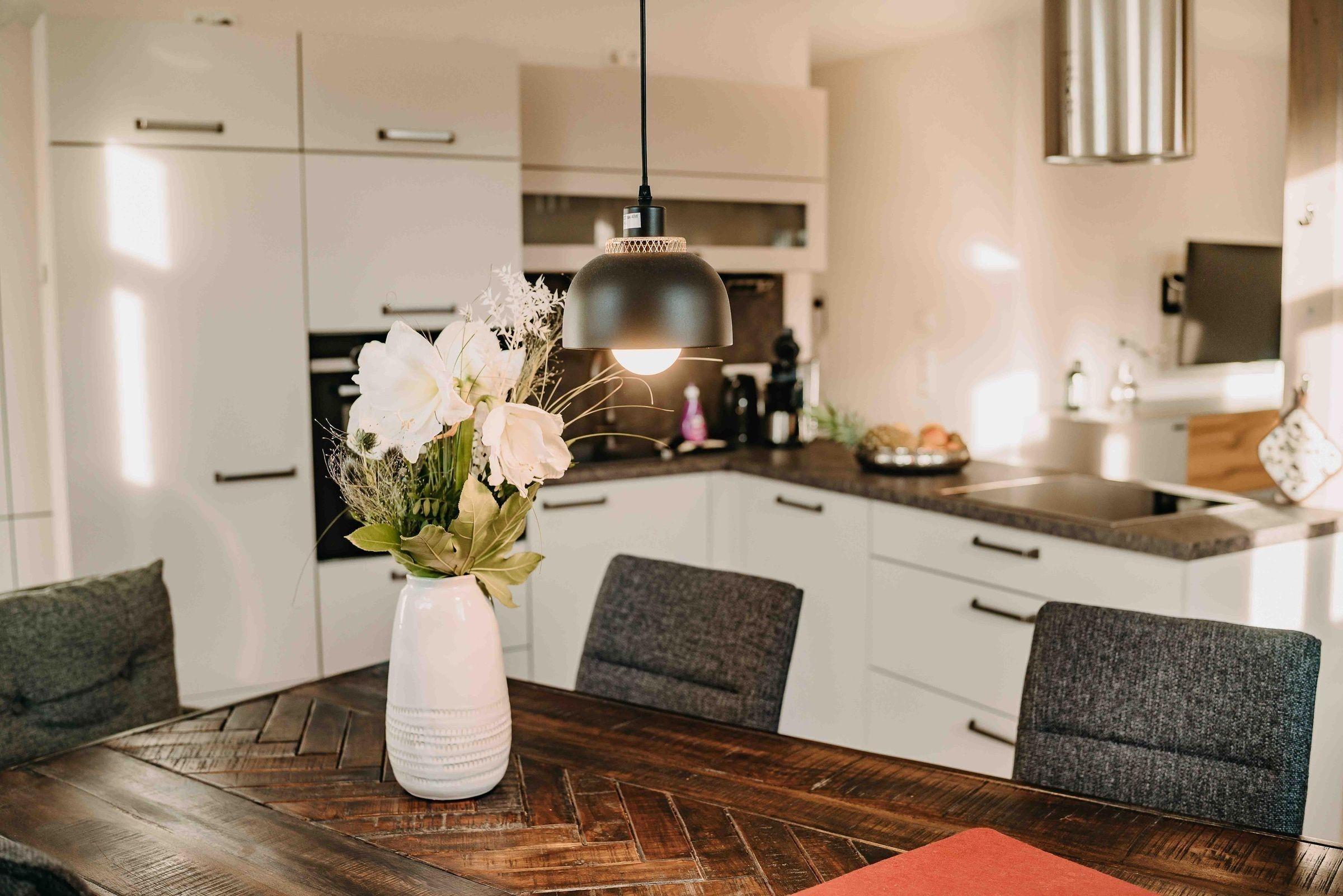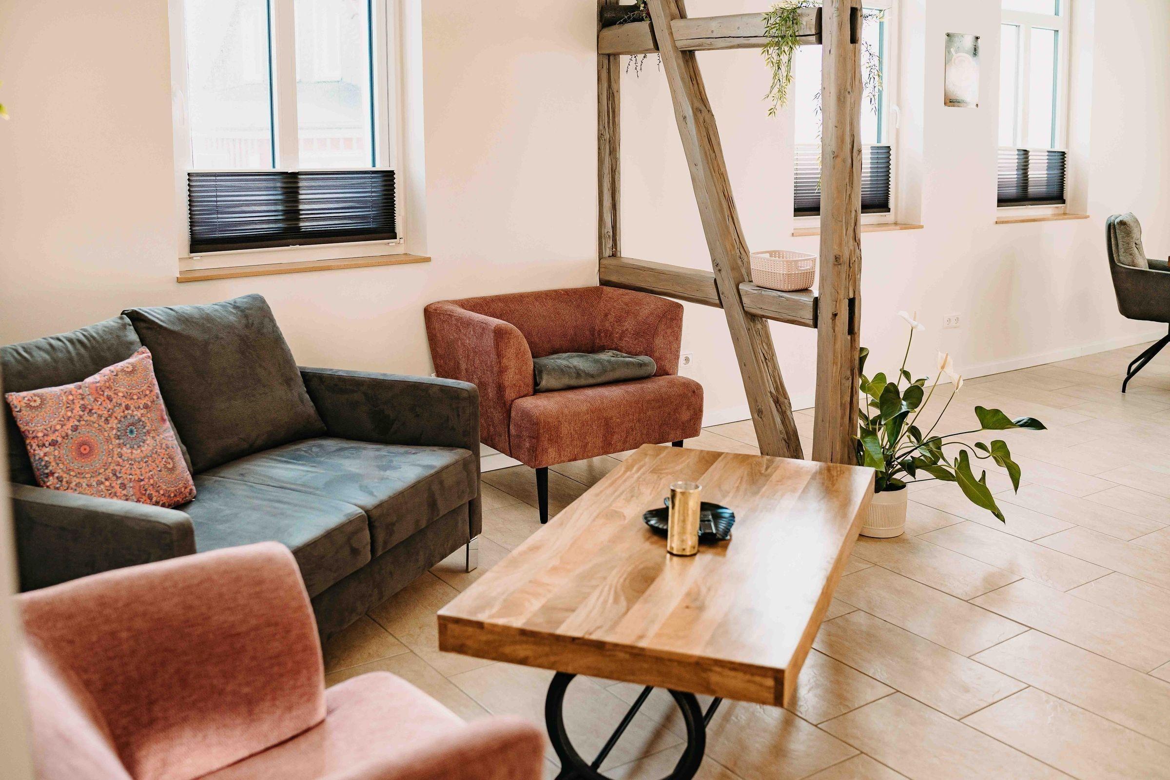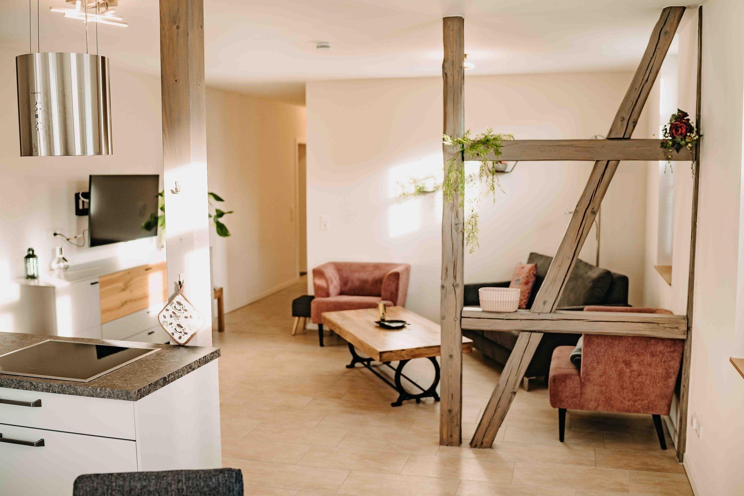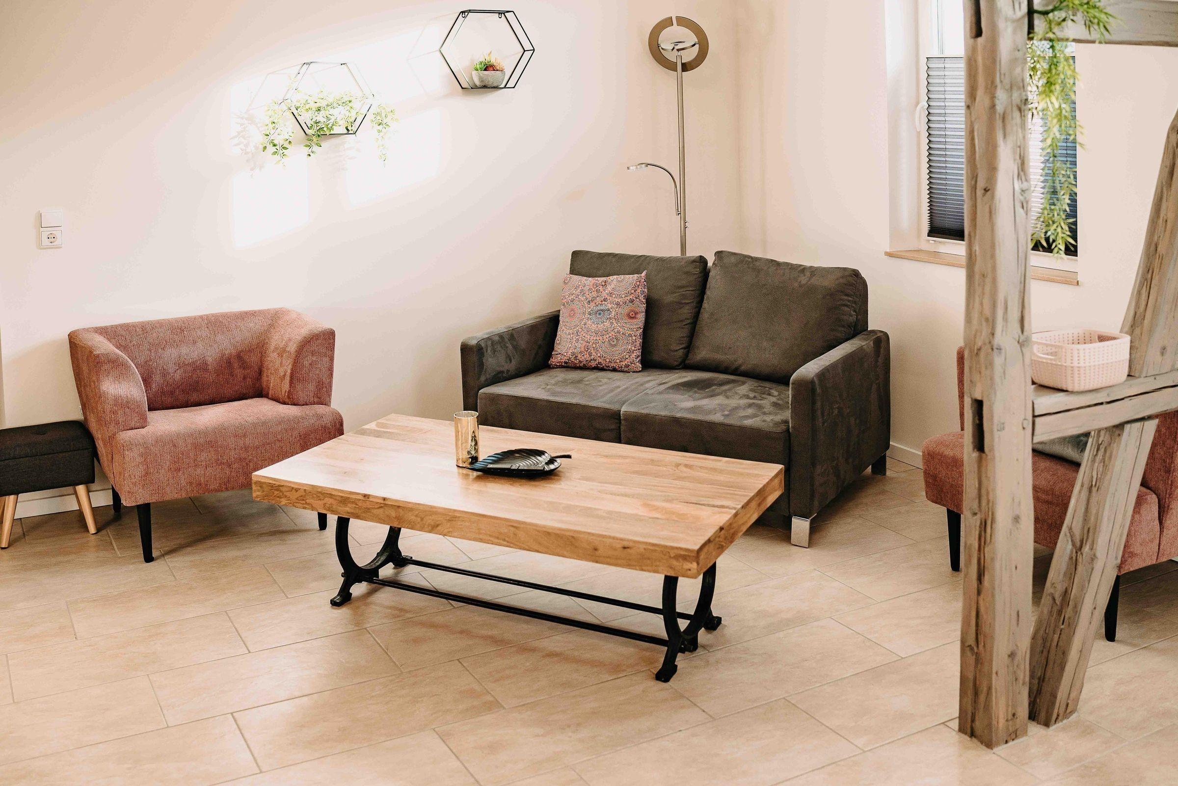 Die Ferienwohnung bietet eine stilvolle und gut durchdachte Ausstattung, die den Aufenthalt für jeden Gast angenehm gestaltet. Der offene Küchenbereich ist mit modernen Geräten ausgestattet, darunter ein Elektro-/Gasherd, Backofen, Geschirrspüler und Kühlschrank. Eine Mikrowelle und Kaffeemaschine stehen ebenfalls zur Verfügung. Im Wohnschlafzimmer finden sich eine bequeme Schlafcouch sowie ein Esstisch, ideal für gesellige Abende. Es gibt zwei Schlafzimmer, eines mit einem Doppelbett und das andere mit zwei Einzelbetten. Das Badezimmer verfügt über ein Fenster, eine Duschbadewanne sowie einen Haartrockner. Für Unterhaltung sorgt ein Fernseher. Praktische Annehmlichkeiten wie Waschmaschine, Wäschetrockner, Staubsauger und Parkplatz sind ebenso vorhanden. Zudem sorgt WLAN-Internet für eine durchgehende Verbindung. Die Wohnung ist einladend und komfortabel, perfekt für entspannte Ferien.