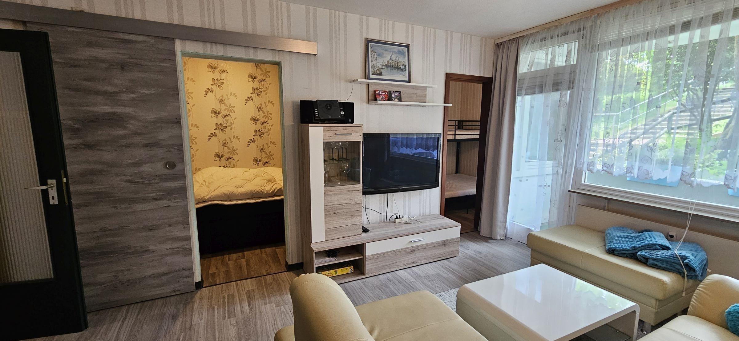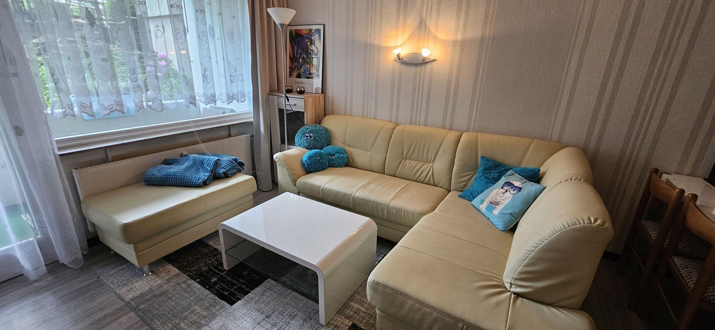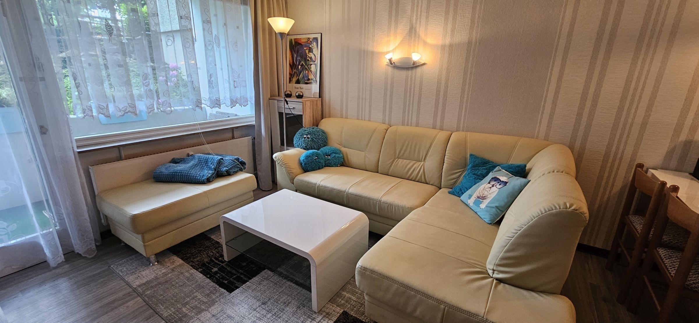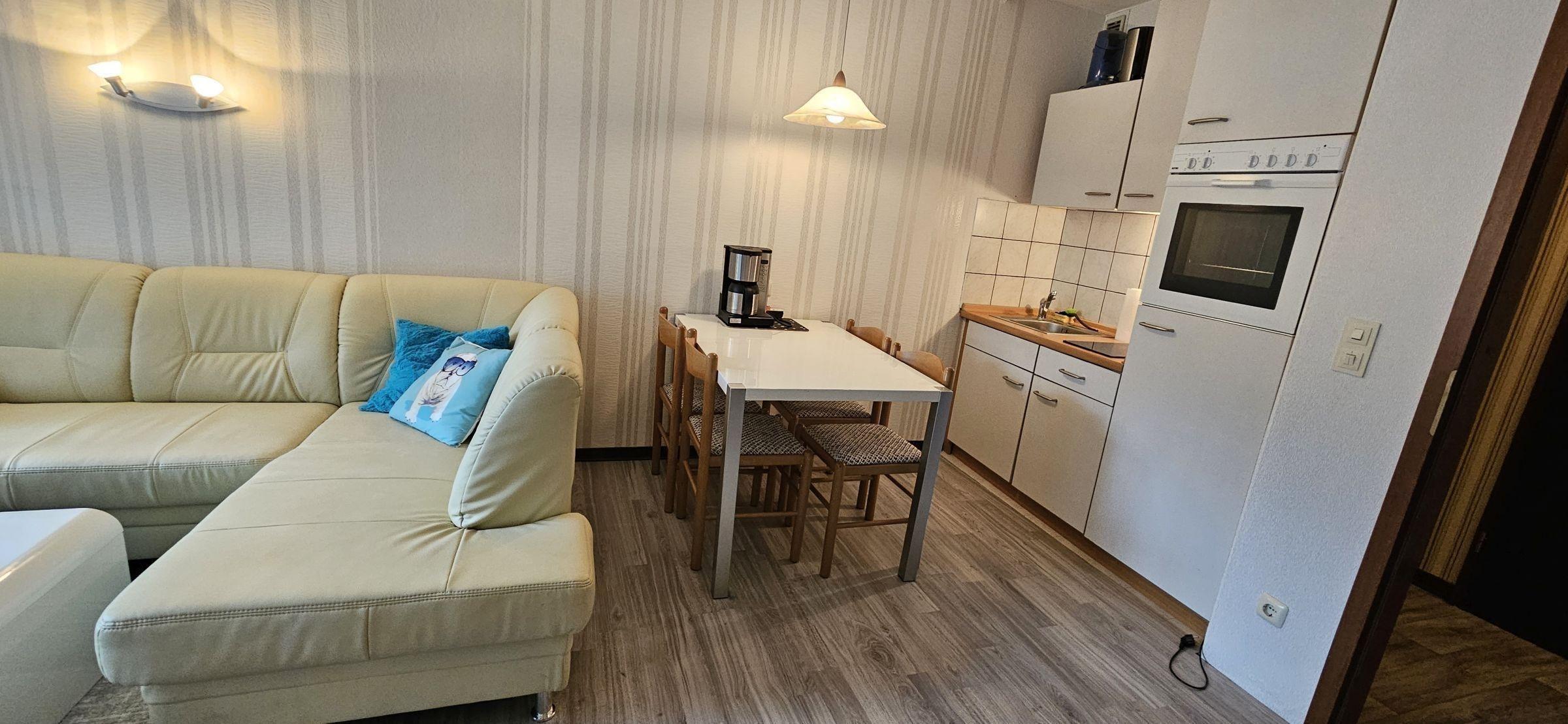 Die Ferienwohnung bietet eine komfortable und seniorengerechte Unterbringung in zwei Schlafzimmern, ausgestattet mit einem Doppelbett und zwei Einzelbetten. Die offene Küche ist modern gestaltet und enthält einen Elektro-/Gasherd, Backofen, Geschirrspüler, Kühlschrank, Kaffeemaschine, Toaster und Wasserkocher. Hier können Gäste ihre Mahlzeiten am Esstisch in geselliger Runde genießen. Das Badezimmer verfügt über eine bodengleiche Dusche, einen Spiegel und ist optimal für barrierefreies Wohnen konzipiert. Ein großzügiges Wohnzimmer mit Sofa und Sessel lädt zum Entspannen ein. Zur Ausstattung gehören zudem WLAN, ein TV sowie praktische Geräte wie Waschmaschine und Wäschetrockner. Ein Fahrstuhl garantiert einen bequemen Zugang. Die Wohnung ist mit Rauchmeldern ausgestattet, um die Sicherheit der Gäste zu gewährleisten. Geschirr, Besteck und Geschirrtücher sind ebenfalls vorhanden, sodass einem angenehmen Aufenthalt nichts im Wege steht.
