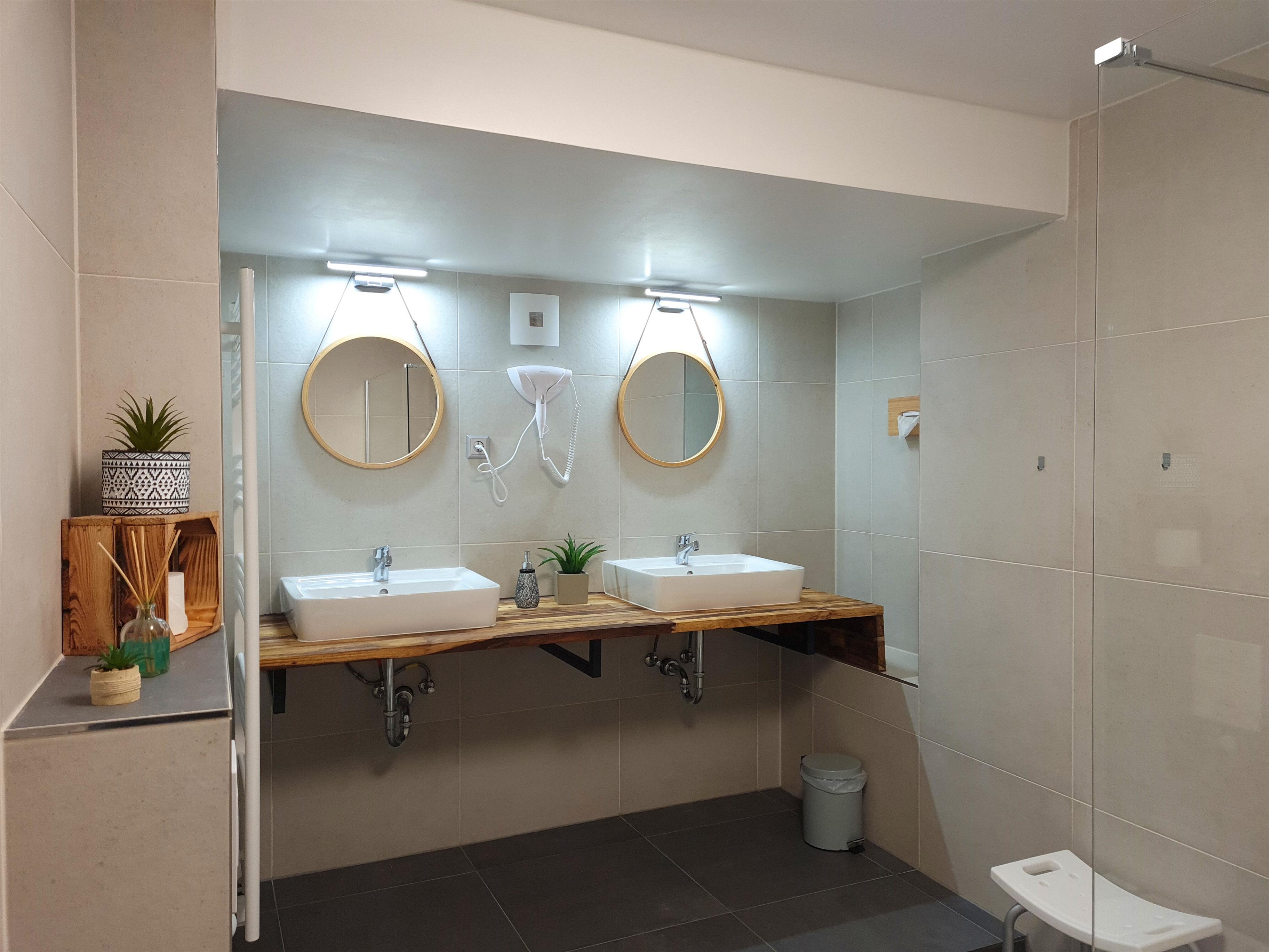 Das Chalet besitzt insgesamt zwei Badezimmer und ein separates WC im oberen Stockwerk. Das große Badezimmer kann mit einer geräumigen Eckbadewanne punkten. Wer lieber duschen möchte, kann das im zweiten Badezimmer des Hauses tun.