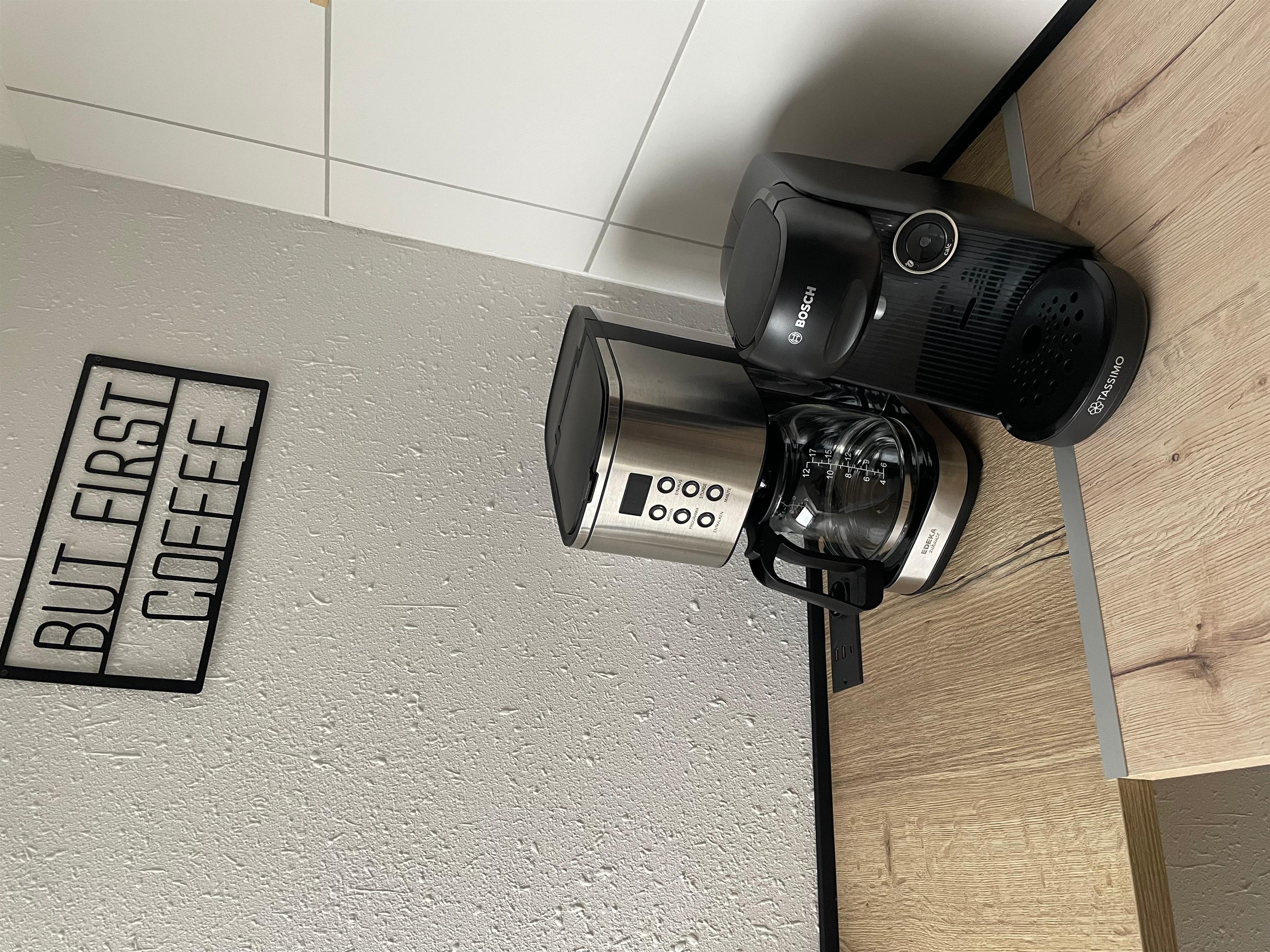In der Küche stehen neben einem Ofen, einer Kühl-Gefrierkombi, einem Herd, einer Spülmaschine, und einer Mikrowelle auch 2 Kaffeemaschinen (Filter & Bosch Tassimo) bereit.