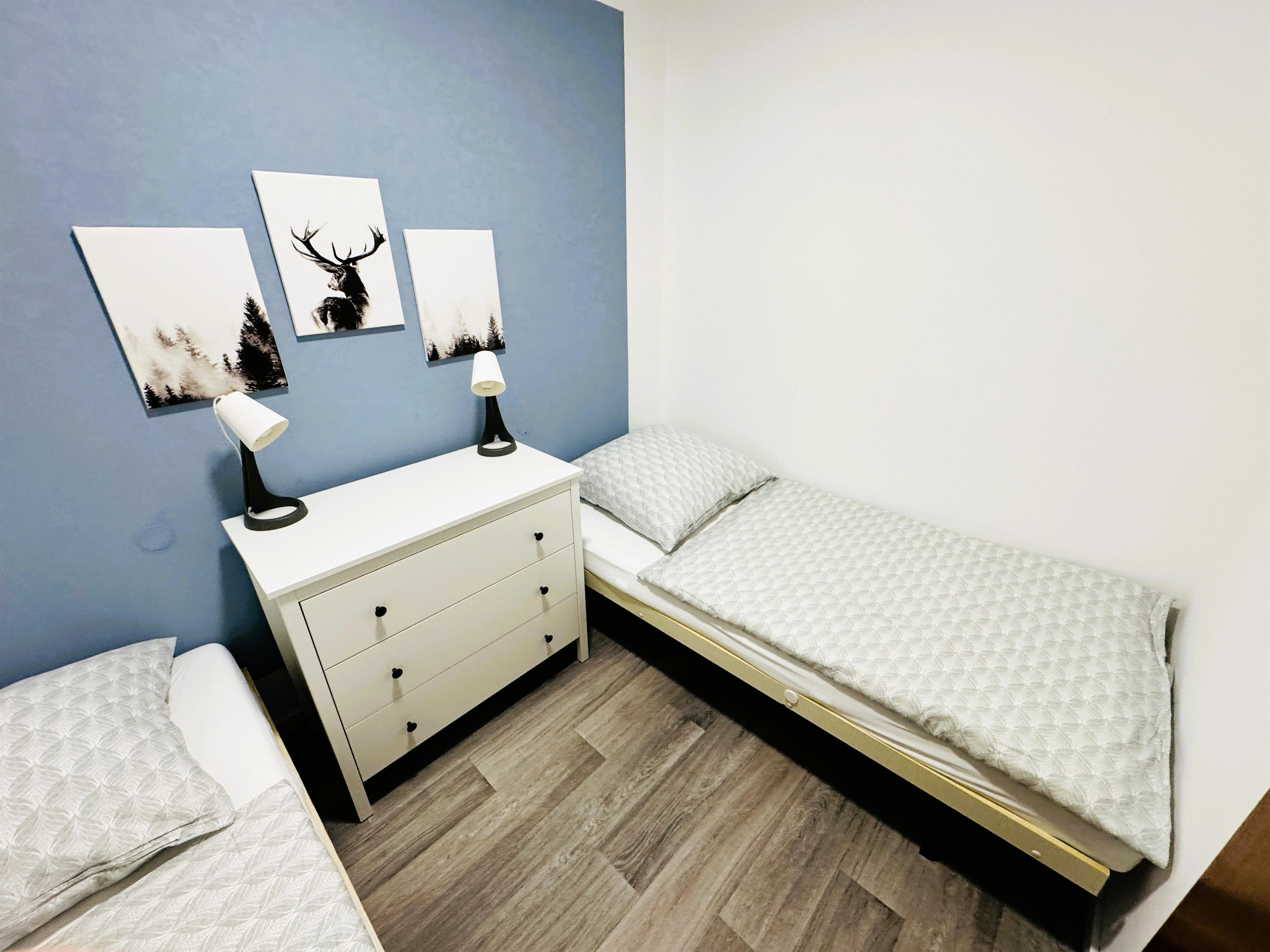 • 2 separate Schlafzimmer (1 Doppelbett, 2 Einzelbetten, 1 Extra-Gäste-Klappbett)