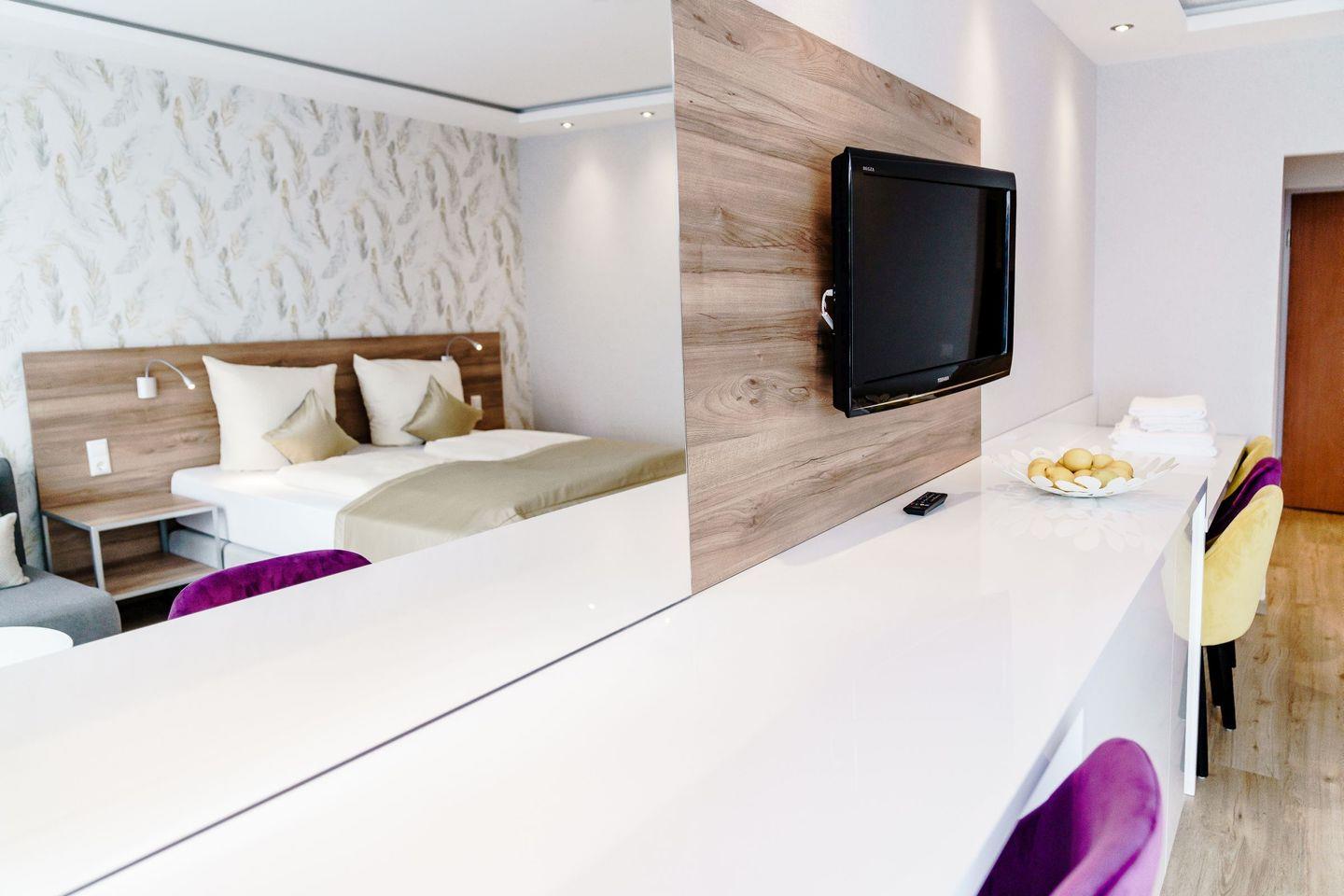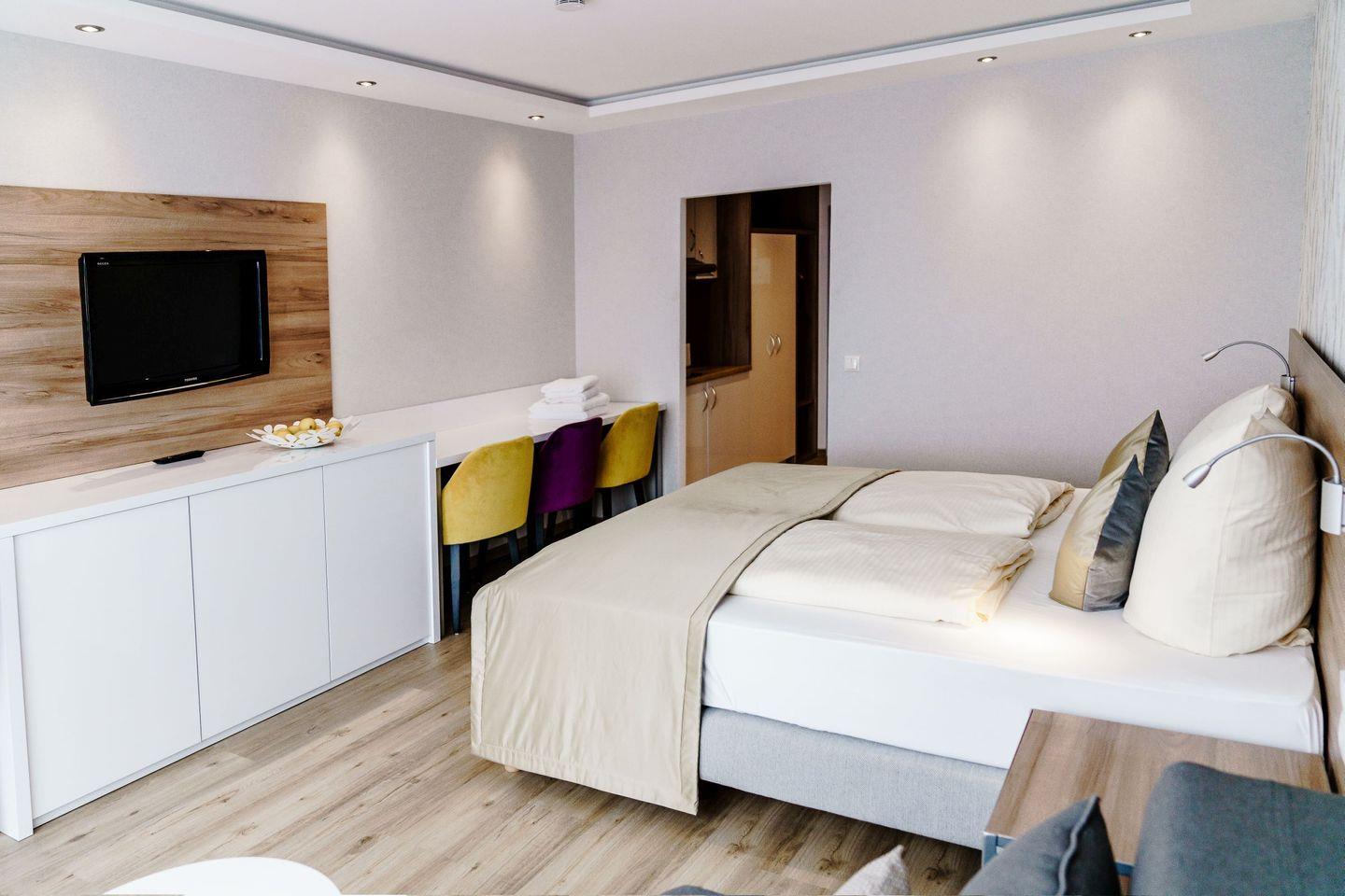 Die voll ausgestatteten Ferienwohnungen sind geprägt von einer harmonischen Farbkombination in der Sie sich garantiert wohlfühlen werden und es Ihnen an nichts fehlen wird. Vom Balkon aus genießen Sie eine Panoramaaussicht, wahlweise auf den See oder den berühmten Bocksberg. Die bequemen Balkonmöbel laden zum Verweilen mit ihren Liebsten ein.