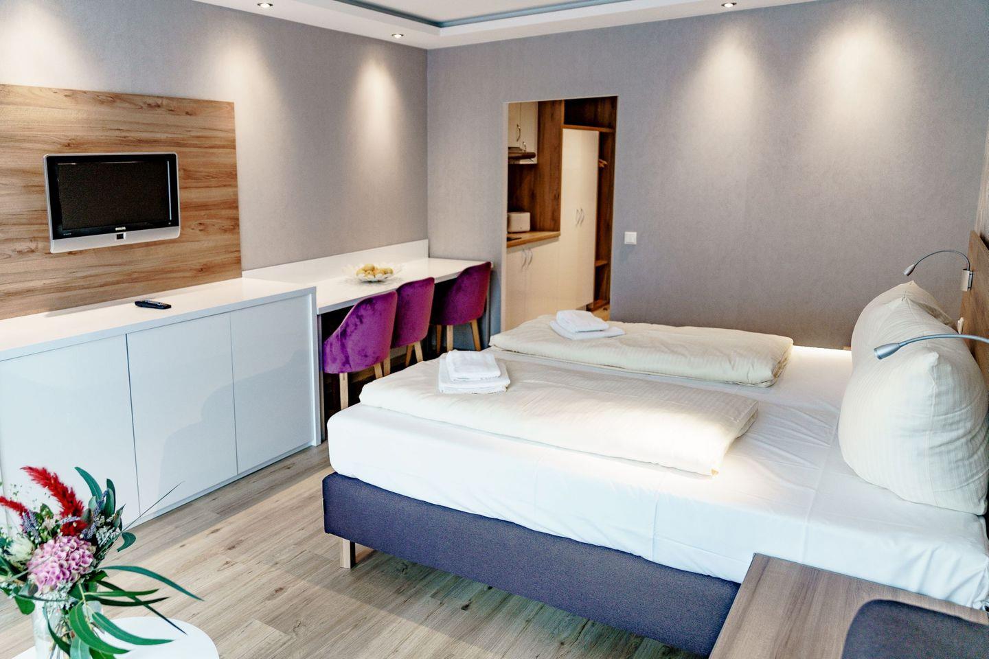 Die voll ausgestatteten Ferienwohnungen sind geprägt von einer harmonischen Farbkombination in der Sie sich garantiert wohlfühlen werden und es Ihnen an nichts fehlen wird. Vom Balkon aus genießen Sie eine Panoramaaussicht, wahlweise auf den See oder den berühmten Bocksberg. Die bequemen Balkonmöbel laden zum Verweilen mit ihren Liebsten ein.
