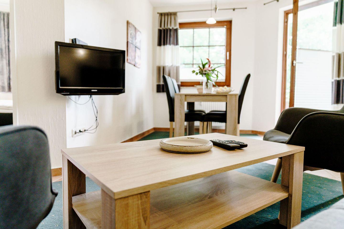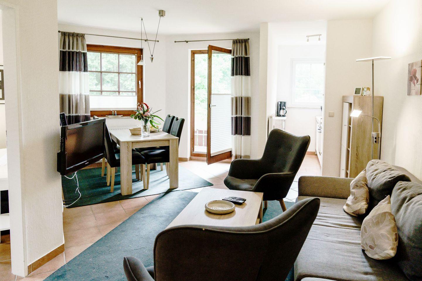 Die Bocksbergblick Fewo BB 02 bietet auf 50 m² Platz für bis zu vier Personen und ist sowohl familien- als auch haustierfreundlich. Die moderne Ausstattung umfasst eine offene Küche, zwei TVs, WLAN, Balkon, Garten mit Gasgrill sowie komfortable Schlaf- und Wohnbereiche. Ski- und Wandergebiete, Restaurants und Einkaufsmöglichkeiten befinden sich in unmittelbarer Nähe.