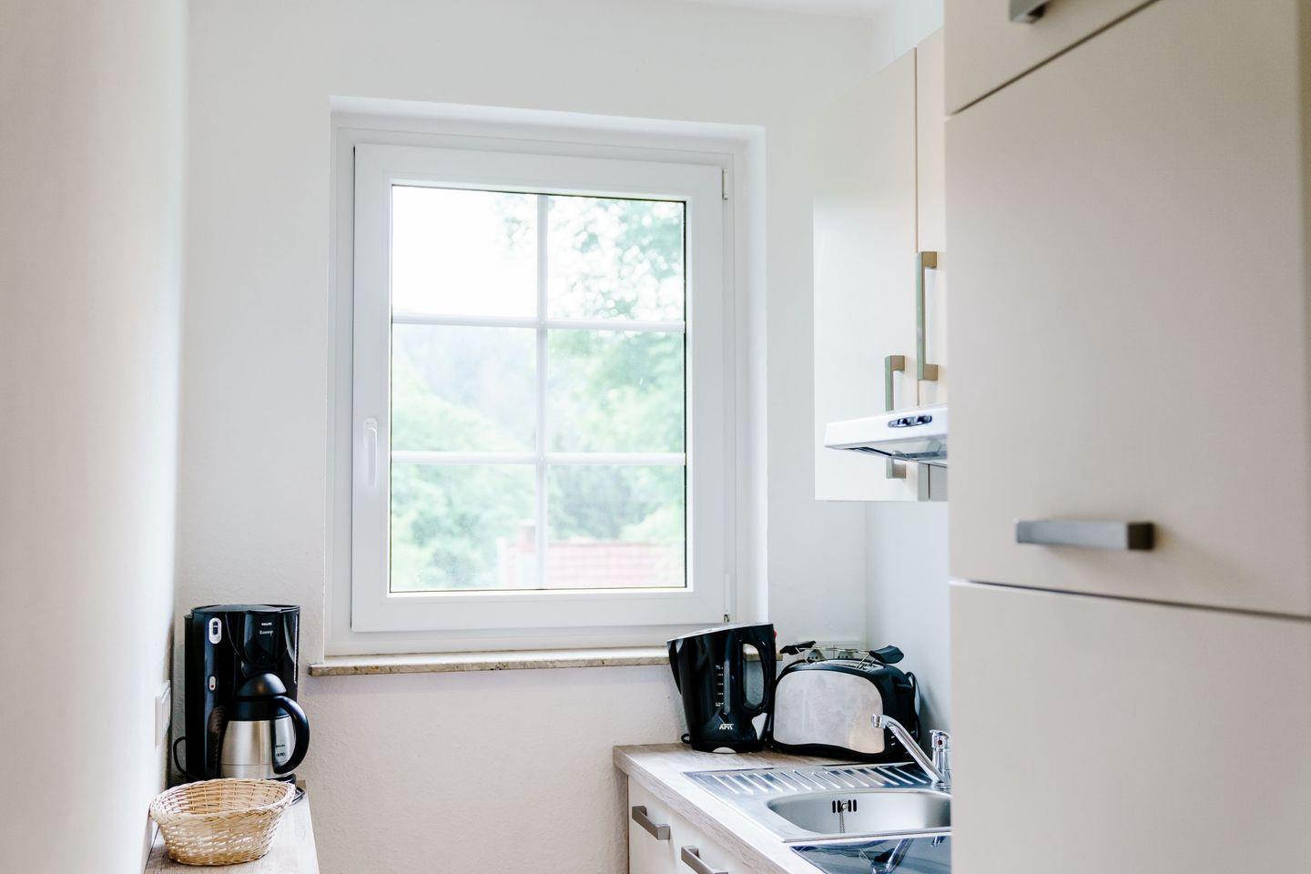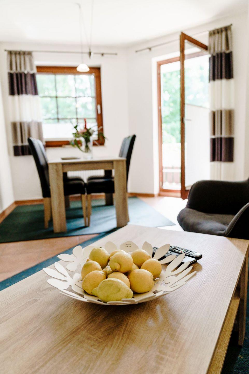 Die offene und gut ausgestattete Küche ist ein weiteres Highlight der Unterkunft. Sie verfügt über moderne Geräte wie eine Induktionsplatte, einen Backofen, eine Spülmaschine und einen Kühlschrank mit Gefrierfach. Hier können Sie Ihre Kochkünste entfalten und gemütliche Mahlzeiten zubereiten, während Sie den Blick in den Garten genießen, der zur Wohnung gehört. Der Balkon mit Gartenmöbeln und Sonnenschirm lädt ein, die frische Luft zu genießen und die wunderschöne Aussicht auf die umliegenden Wälder und Berge zu bewundern.