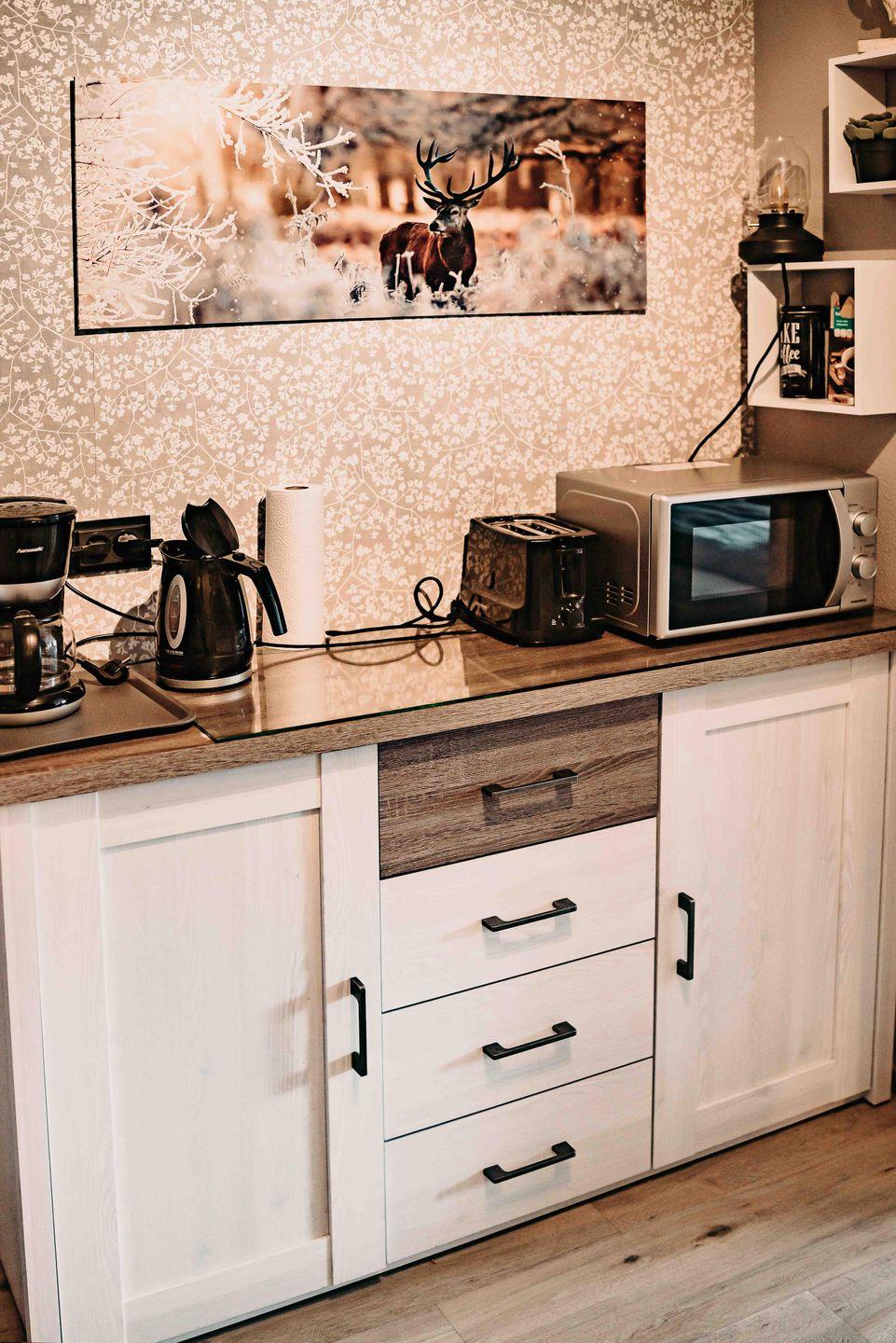 -Pantryküche inkl. 2-Plattenherd, Kühlschrank, Wasserkocher, Kaffeemaschine, Toaster