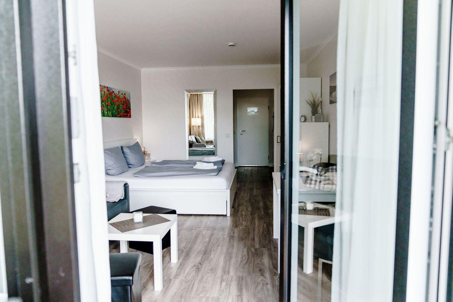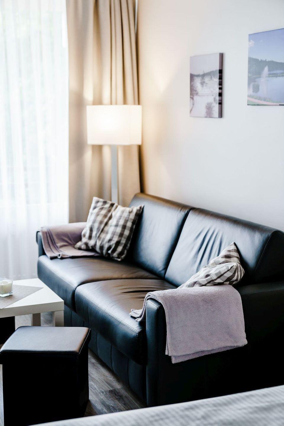 In dem modern eingerichteten Wohn-/Schlafbereich steht ein gemütliches Doppelbett sowie eine Schlafcouch für erholsame Nächte bereit.