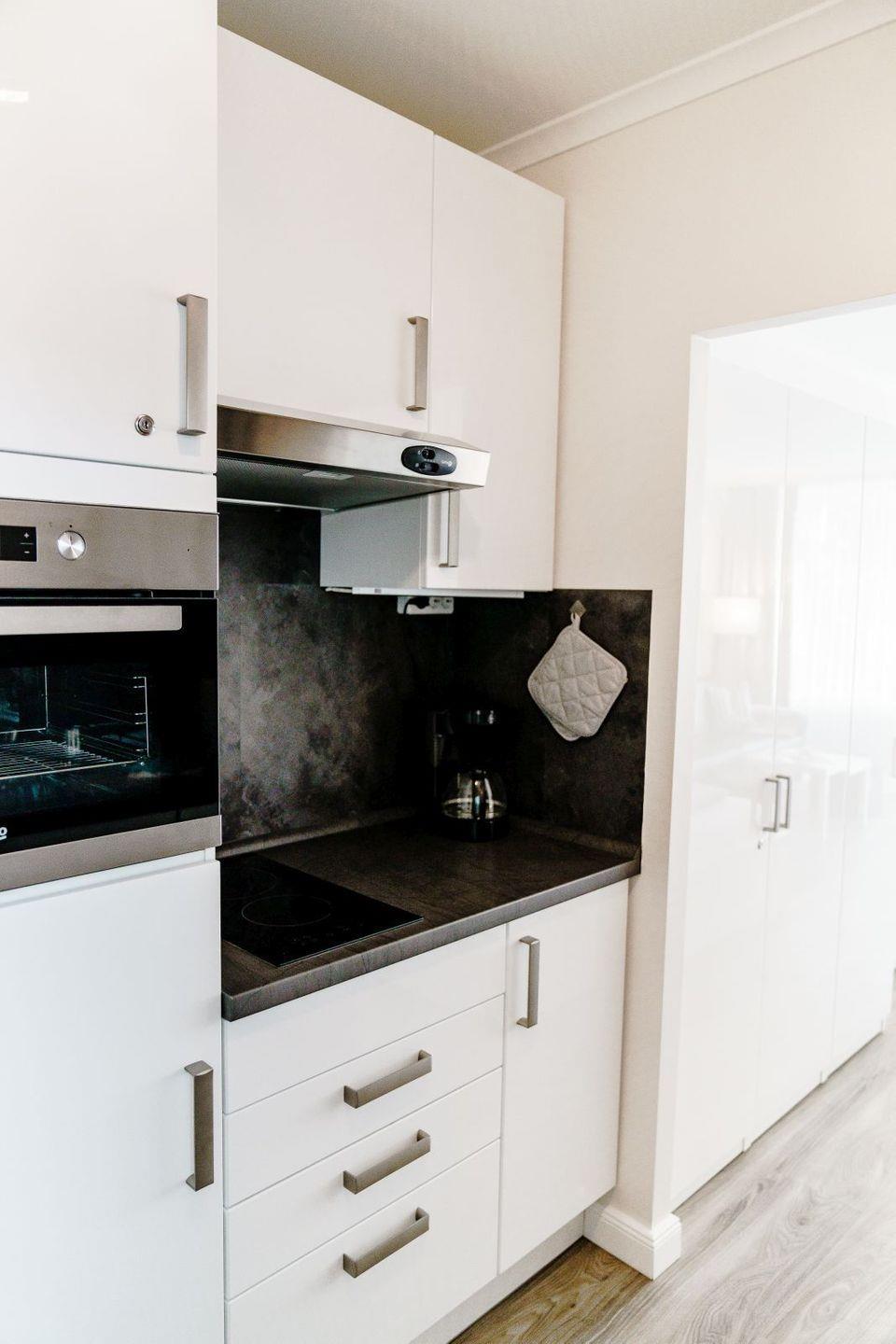 Die offene Küchenzeile ist mit Mikrowelle, 2-Platten-Ceran-Herd, Spülmaschine, Kühlschrank mit Gefrierfach, Kaffeemaschine, Wasserkocher und vielem mehr voll ausgestattet.
