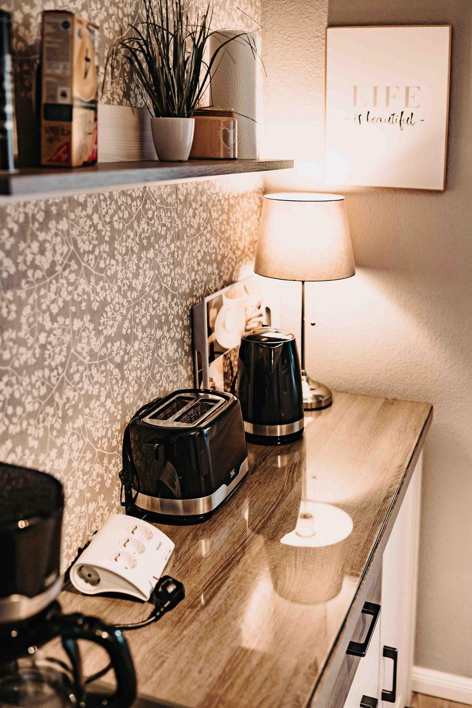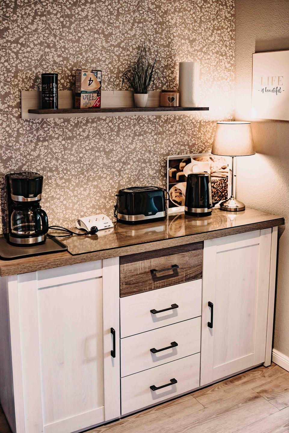-Pantryküche inkl. 2-Plattenherd, Kühlschrank, Wasserkocher, Kaffeemaschine, Toaster
