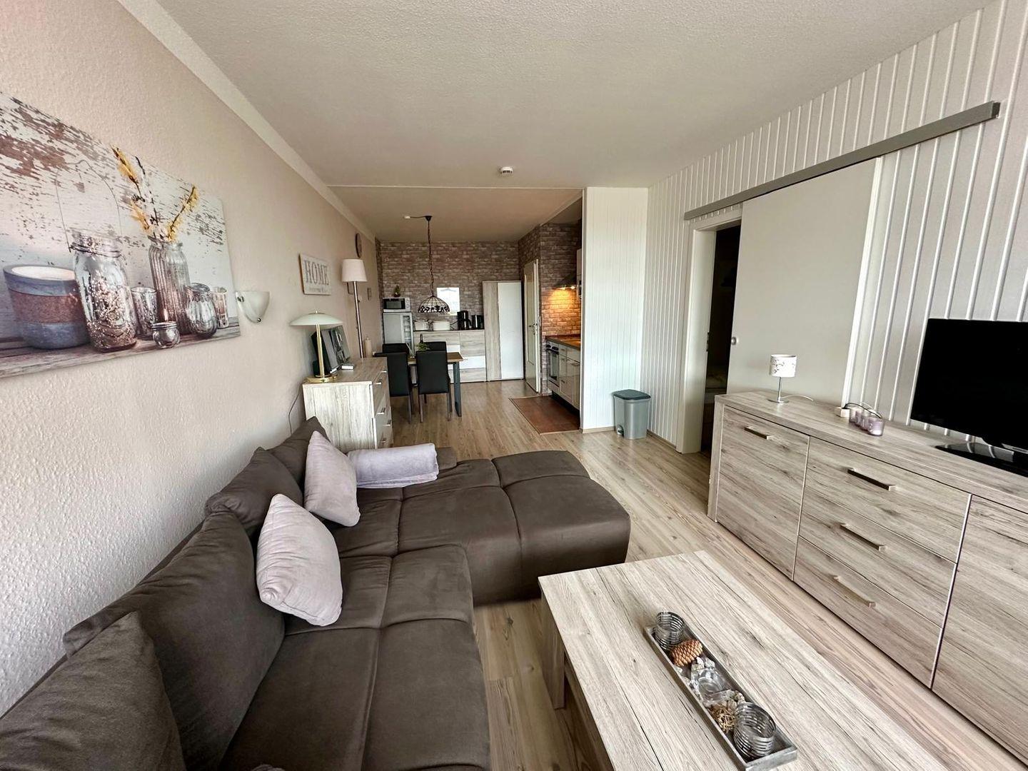 Die Wohnung verfügt über zwei komfortable Schlafzimmer, die mit hochwertiger Bettwäsche ausgestattet sind und zum Entspannen einladen. In der offenen Küche, die zum Wohnzimmer übergeht, finden Sie alles, was Sie benötigen – von modernen Küchenutensilien über eine Kaffeemaschine und einen Toaster bis hin zu einem Backofen und einem Kühlschrank mit Gefrierfach. Ob ein richtiges Frühstück oder ein gemütliches Abendessen, Sie können Ihre kulinarischen Fähigkeiten hier voll entfalten!