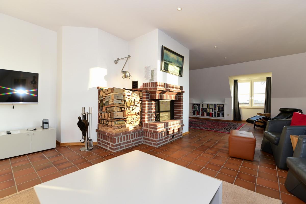 Das gemütliche Wohnzimmer mit hochwertigen Möbeln, offenem Kamin und kleiner Bibliothek lädt zu entspannten Abenden ein. Beginnen Sie den Tag mit einem Frühstück auf dem Südbalkon und beobachten Sie bei klarer Sicht die Fähren auf dem Meer. Die offene, voll ausgestattete Küche mit großem Essbereich ist ideal für gesellige Mahlzeiten.