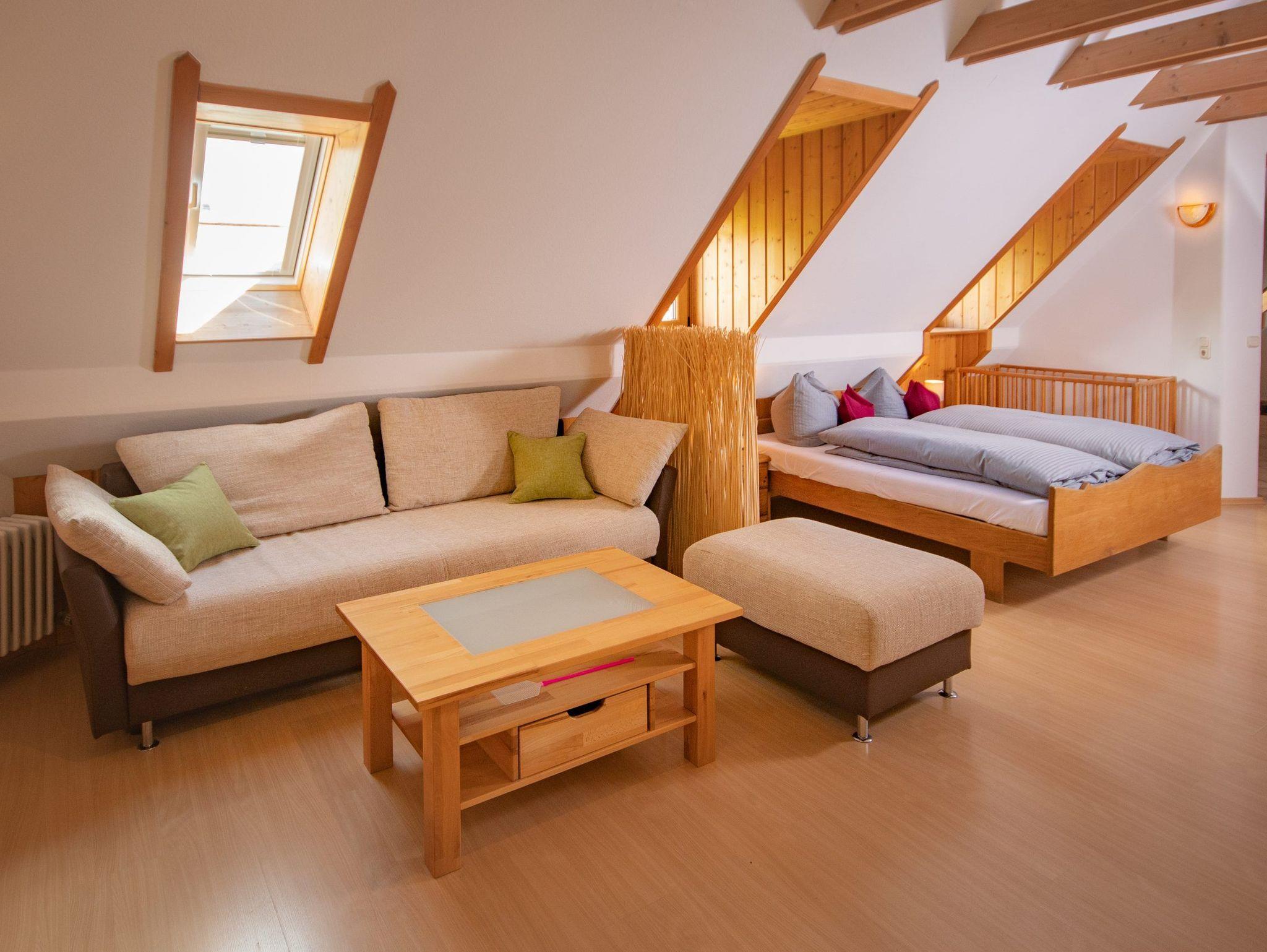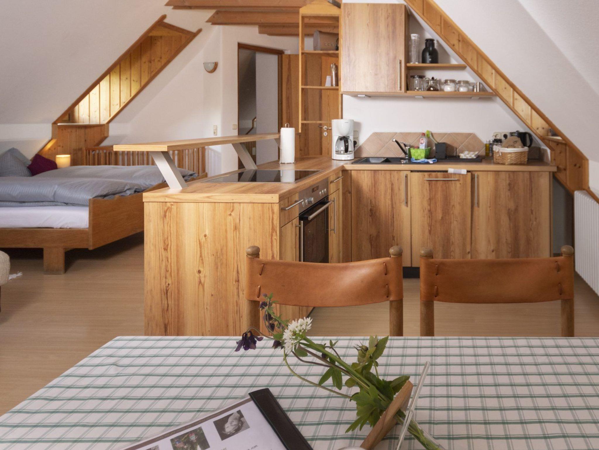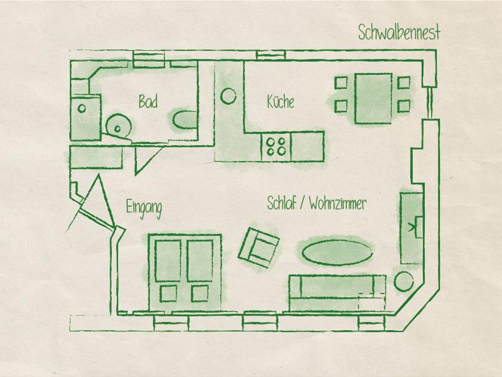 Unser Appartement „Schwalbennest“ befindet sich im zweiten Stock unseres Gästehauses ? Ihr Blick schweift über den Obstgarten. Sie wohnen in einem großzügigen Wohn-Schlafraum (40qm) mit integrierter Küchenzeile und seperatem Bad. In der Kombination mit dem Spatzennest können Sie mit 2 App. die Vorteile einer Ferienwohnung nutzen. In diesem Fall benutzen nur Sie das komplette Stockwerk und können in zwei getrennten Einheiten Ihren Urlaub genießen.