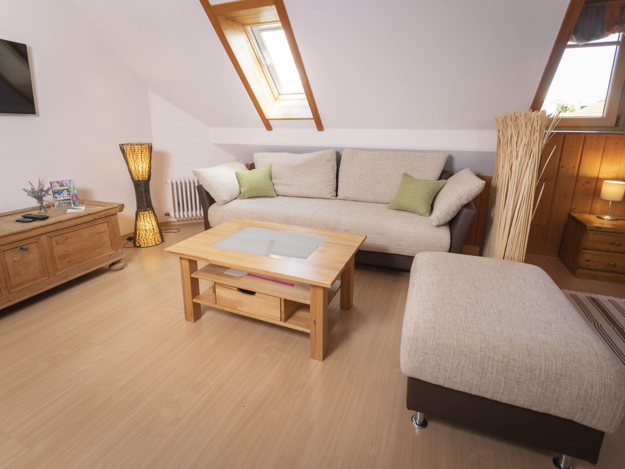 Unser Appartement „Schwalbennest“ befindet sich im zweiten Stock unseres Gästehauses ? Ihr Blick schweift über den Obstgarten. Sie wohnen in einem großzügigen Wohn-Schlafraum (40qm) mit integrierter Küchenzeile und seperatem Bad. Das Appartement ist für 2 bis max. 4 Personen (auf der Ausziehcouch) geeignet. In der Kombination mit dem Spatzennest können Sie mit 2 App. die Vorteile einer Ferienwohnung nutzen. In diesem Fall benutzen nur Sie das komplette Stockwerk und können in zwei getrennten Einheiten Ihren Urlaub genießen.
