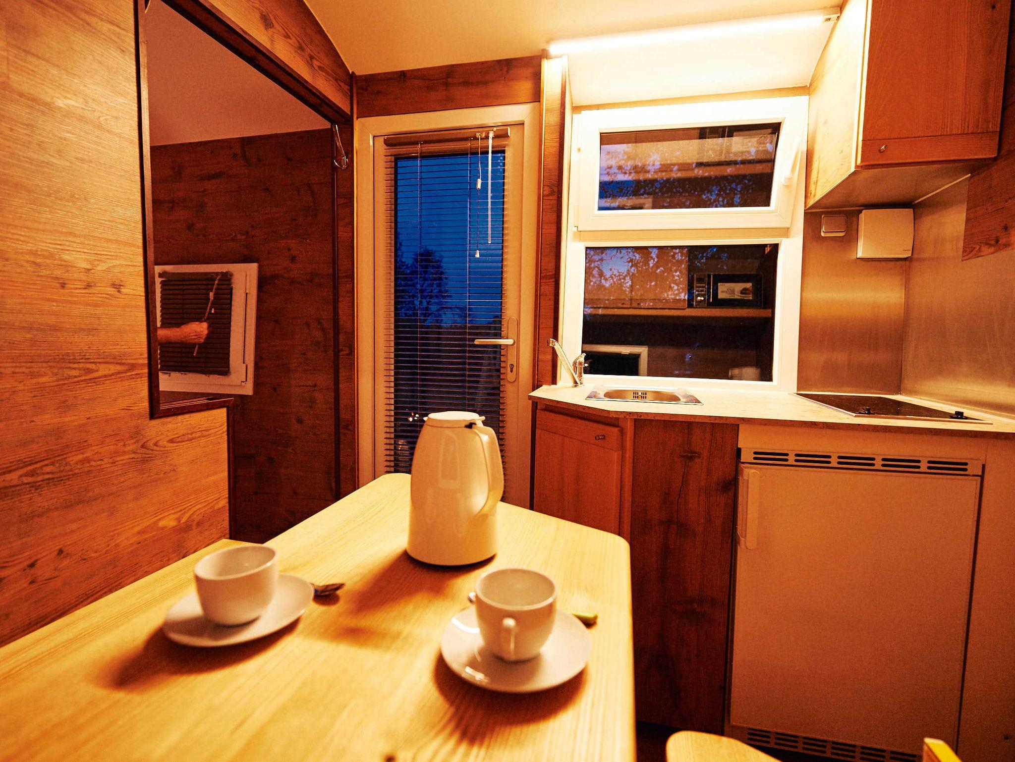 ausgestattete Küchenzeile mit Kühlschrank, Kochfeld, Wasserkocher und