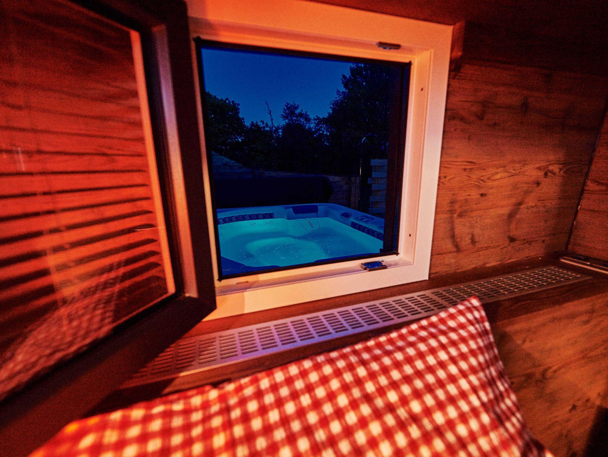 Dieser Schäferwagen verfügt die Annehmlichkeiten eines Whirlpools und einer Sauna.