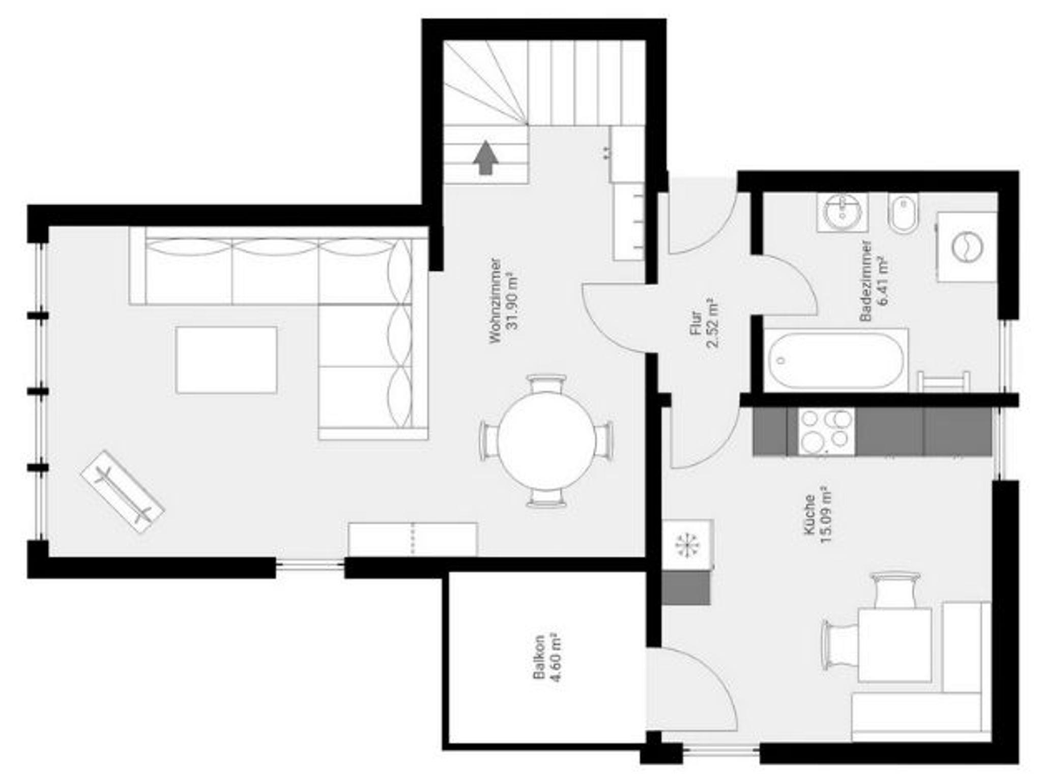 Die Wohnung erstreckt sich über 2 Etagen. Auf der ersten Etage befindet sich ein großes Wohnzimmer mit extra Tisch und Stühlen, eine Wohnlandschaft und Sat-TV. Eine Küche mit Eßecke, Geschirrspüler, Mikrowelle usw.. Von der Küche aus kann man die überdachte Loggia betreten. Außerdem ein Badezimmer mit Badewanne, Toilette und Waschmaschine.