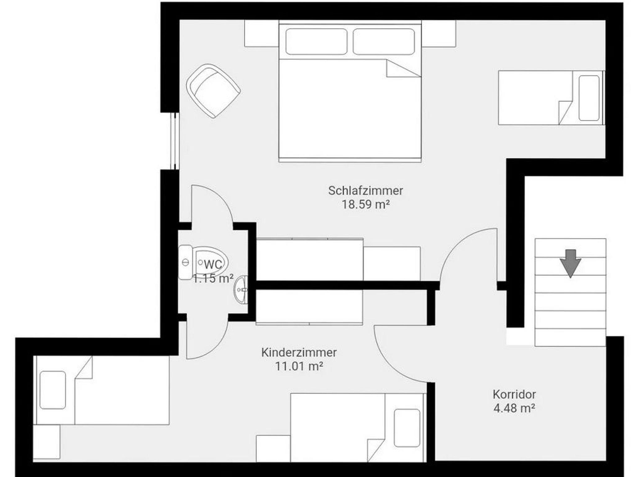 Auf der zweiten Etage befinden sich die beiden Schlafzimmer, eines mit Doppelbett und eines mit zwei getrennten Betten sowie eine extra Toilette.