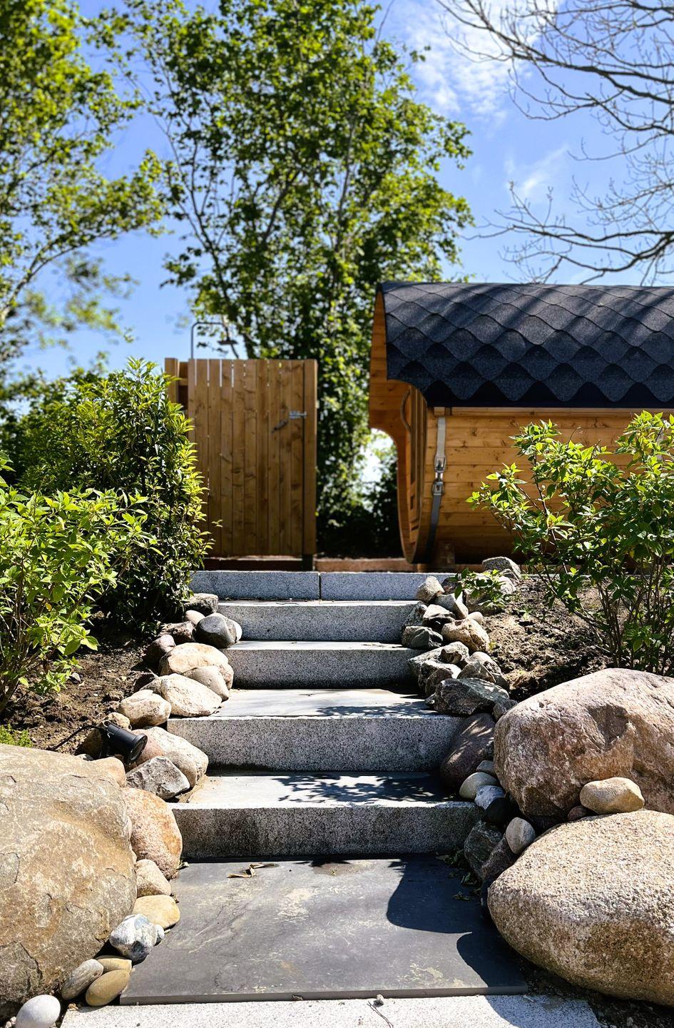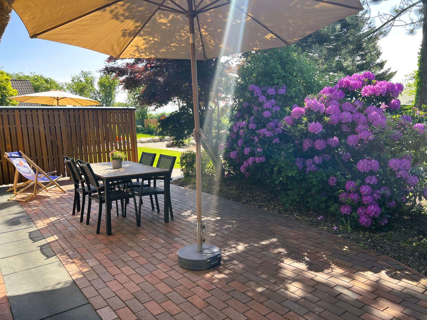 Genießen Sie die Sonne auf Ihrer eigenen Terrasse mit Südausrichtung, ausgestattet mit Gartenmöbeln, Sonnenschirm und Windschutz. Der Gemeinschaftsgarten lädt zum Verweilen ein, während die Gartensauna (Fasssauna - kostenpflichtig - 8,00 € pro Stunde) zur gemeinsamen Nutzung bereitsteht (Münzautomat)– ideal für entspannende Stunden nach einem aktiven Tag. Bitte beachten Sie, dass das Grillen aufgrund des Reetdaches nicht gestattet ist.