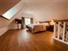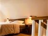 Das Schlafzimmer befindet sich auf einer offenen Galerie und verfügt über ein komfortables Boxspringbett (180x200) mit offenem Fußende. Ein Kleiderschrank sorgt für ausreichend Stauraum, während Verdunklungsmöglichkeiten für erholsame Nächte sorgen. Das moderne Badezimmer ist mit einer ebenerdigen Dusche, WC, Haartrockner sowie einem Waschbecken ausgestattet und bietet durch ein Fenster Tageslicht.