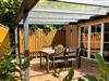 Gartenhaus S – Sommerhaus 54: 45 m² für 2 Gäste, alles in einem Raum. Offene Küche zum Wohnbereich mit Induktionsherd, Backofen, Spülmaschine und Nespresso. WLAN (ab 100 Mbit/s), Kabel-TV und Fliegengitter. Bad mit bodengleicher Dusche plus Gäste-WC. Überdachte Terrasse, Garten mit Möbeln, Liegewiese und Außendusche. Sauna, Privatparkplatz (1), Nichtraucher, 1 Haustier erlaubt. Strand ca. 1,4 km.
