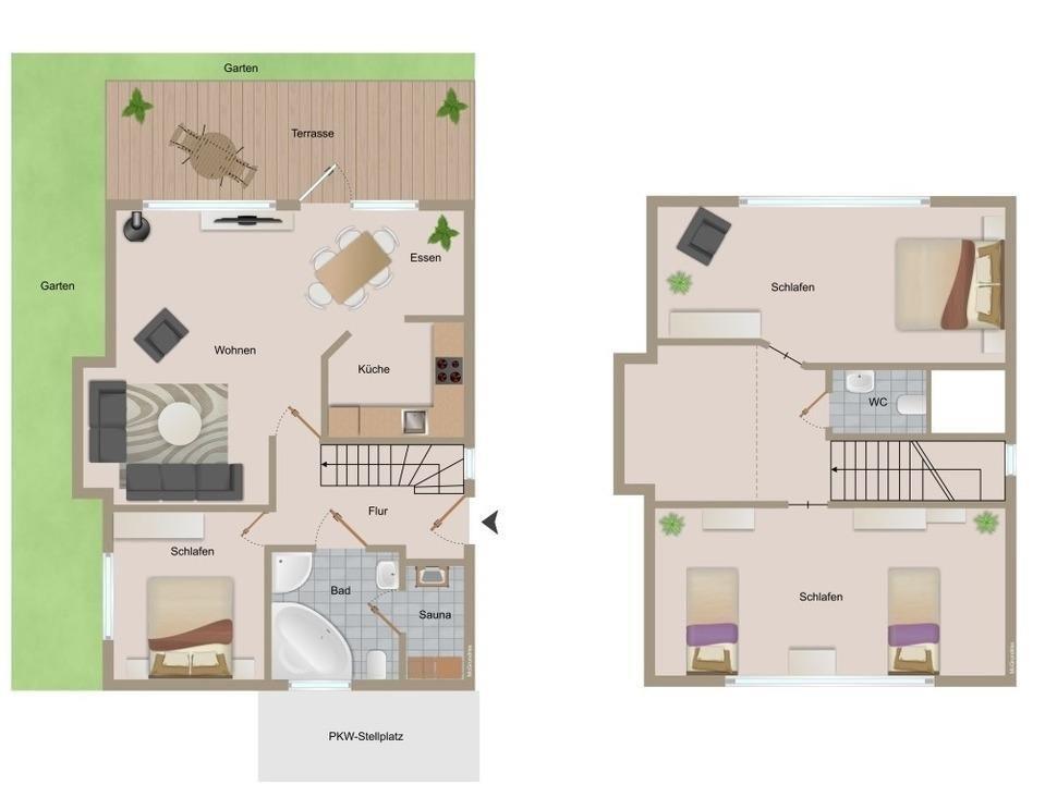 Das Feriendomizil verfügt über 1 komb. Wohn-/Essbereich, 1 offene Küche, 3 Schlafräume, 1 Vollbad, 1 Gäste-WC sowie einen ca. 200 m² großen, komplett eingezäunten Garten.