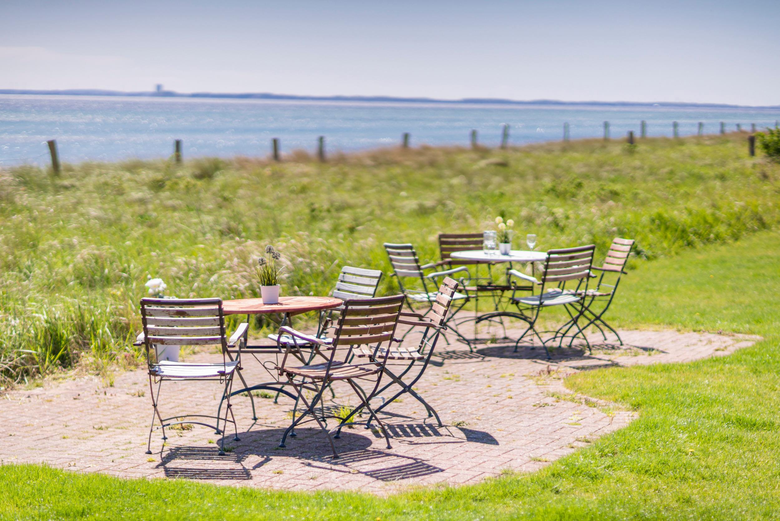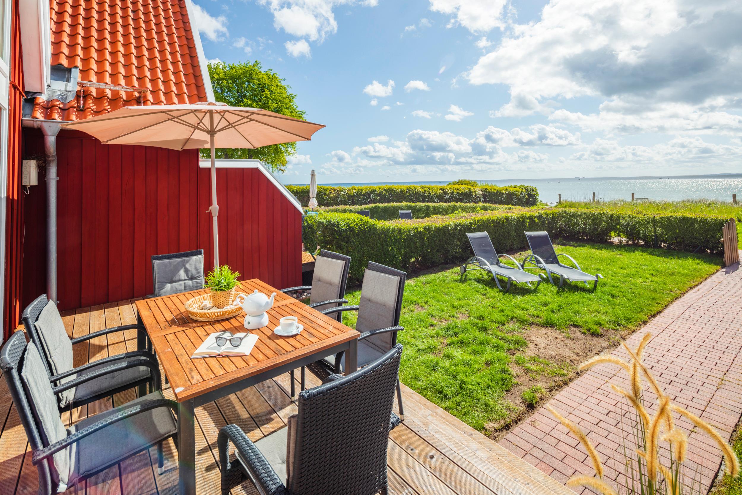 Sonne tanken kannst Du auf der erhöhten Holz-Terrasse. Gartenmöbel, Liegen und ein Sonnenschirm stehen für Dich bereit. Zum Strand gelangst Du über den eigenen Zugang in wenigen Schritten.