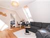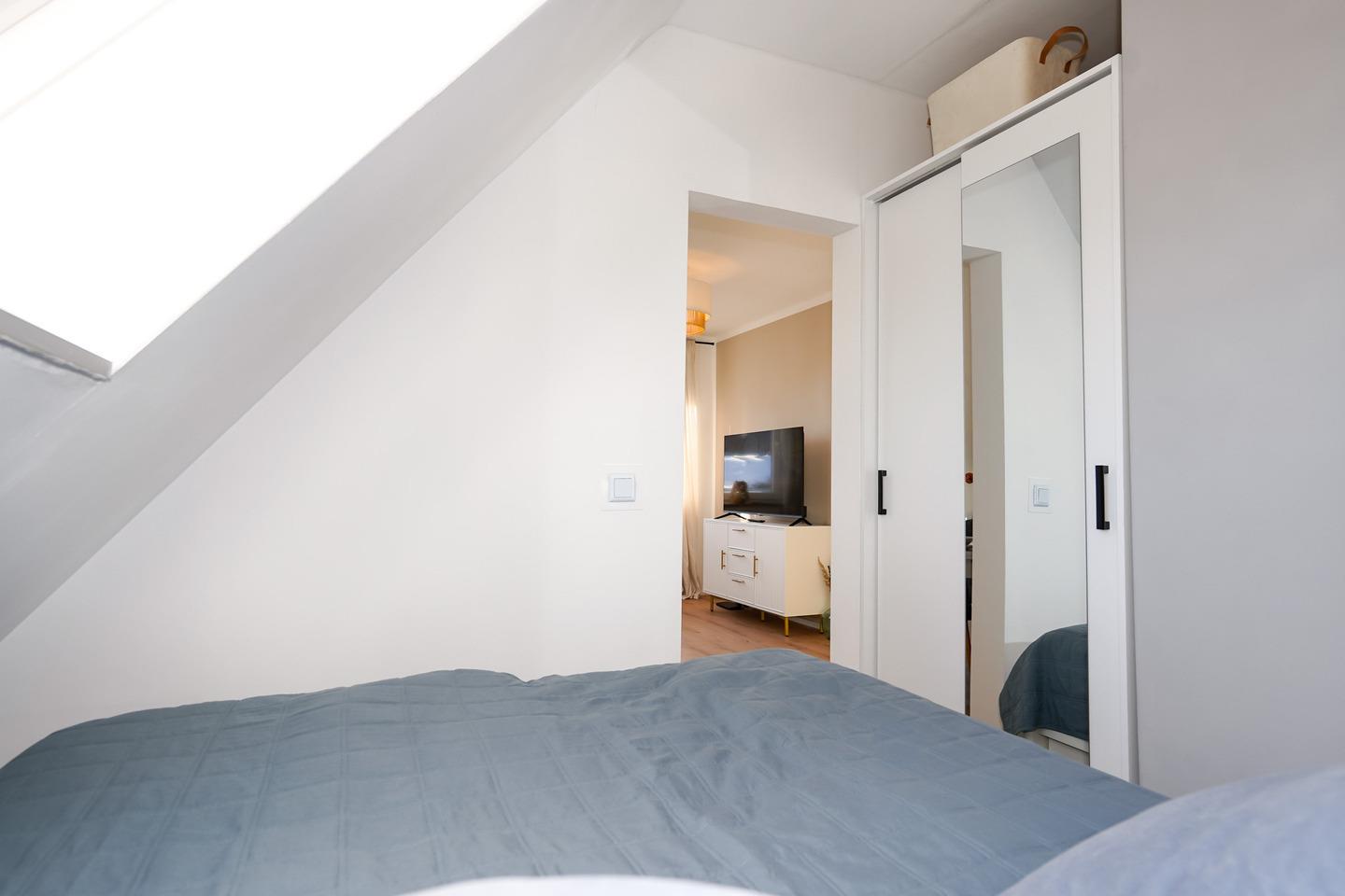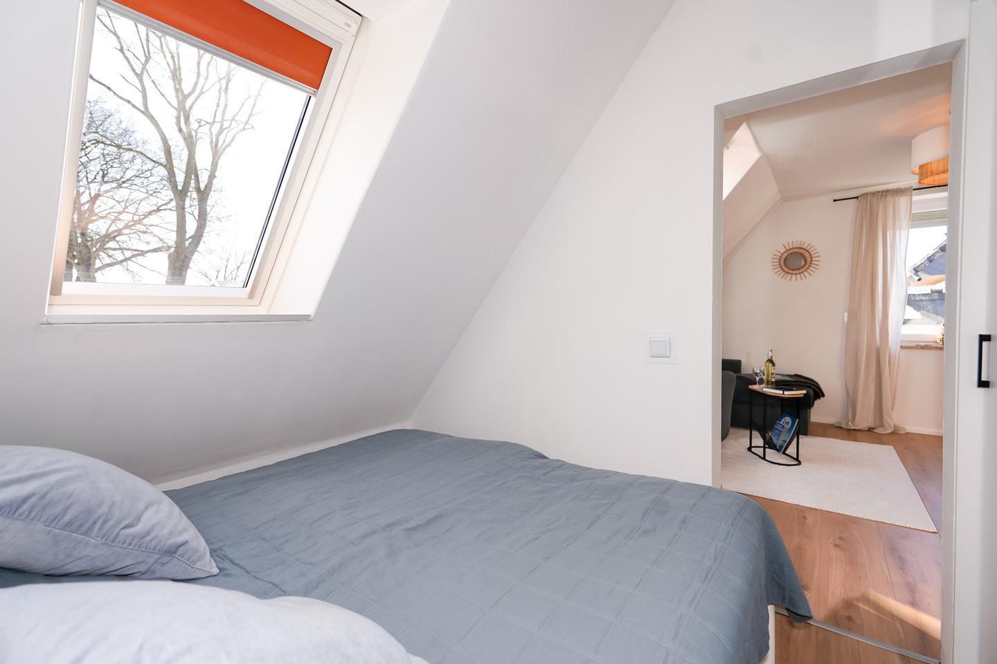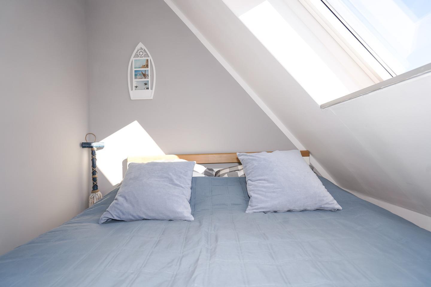 Das Schlafzimmer ist mit einem Doppelbett, Kleiderschrank und Veluxfenster und einem Kleiderschrank ausgestattet, sodass Sie für Ihren Aufenthalt ausreichend Stauraum haben. Der Zugang zur Wohnung erfolgt über eine Treppe, die in das Apartment führt.