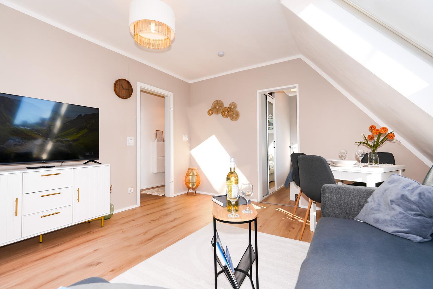 Im Wohnzimmer erwartet Sie eine bequeme Schlafcouch mit einer Liegefläche von ca. 140 cm x 200 cm, perfekt für eine erholsame Nacht. Ein kleiner Esstisch bietet Platz für bis zu vier Personen, ideal für gemeinsame Mahlzeiten.