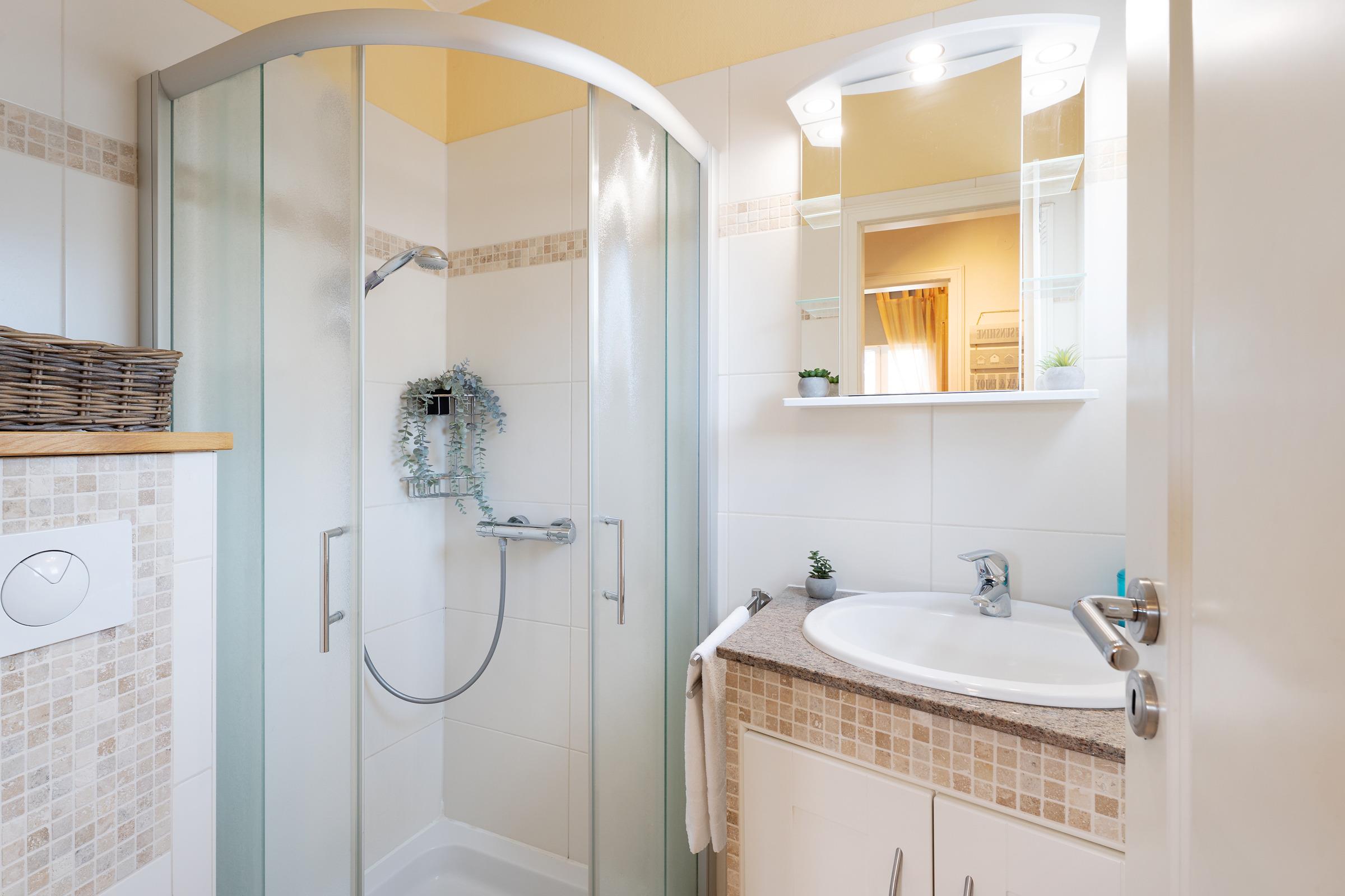 Das Bad mit Dusche sorgt für den Frischekick am Morgen – oder nach einem wohltuenden Saunagang: Denn das Highlight des Hauses ist die private Aufguss-Sauna im Garten – ganz für Sie allein!