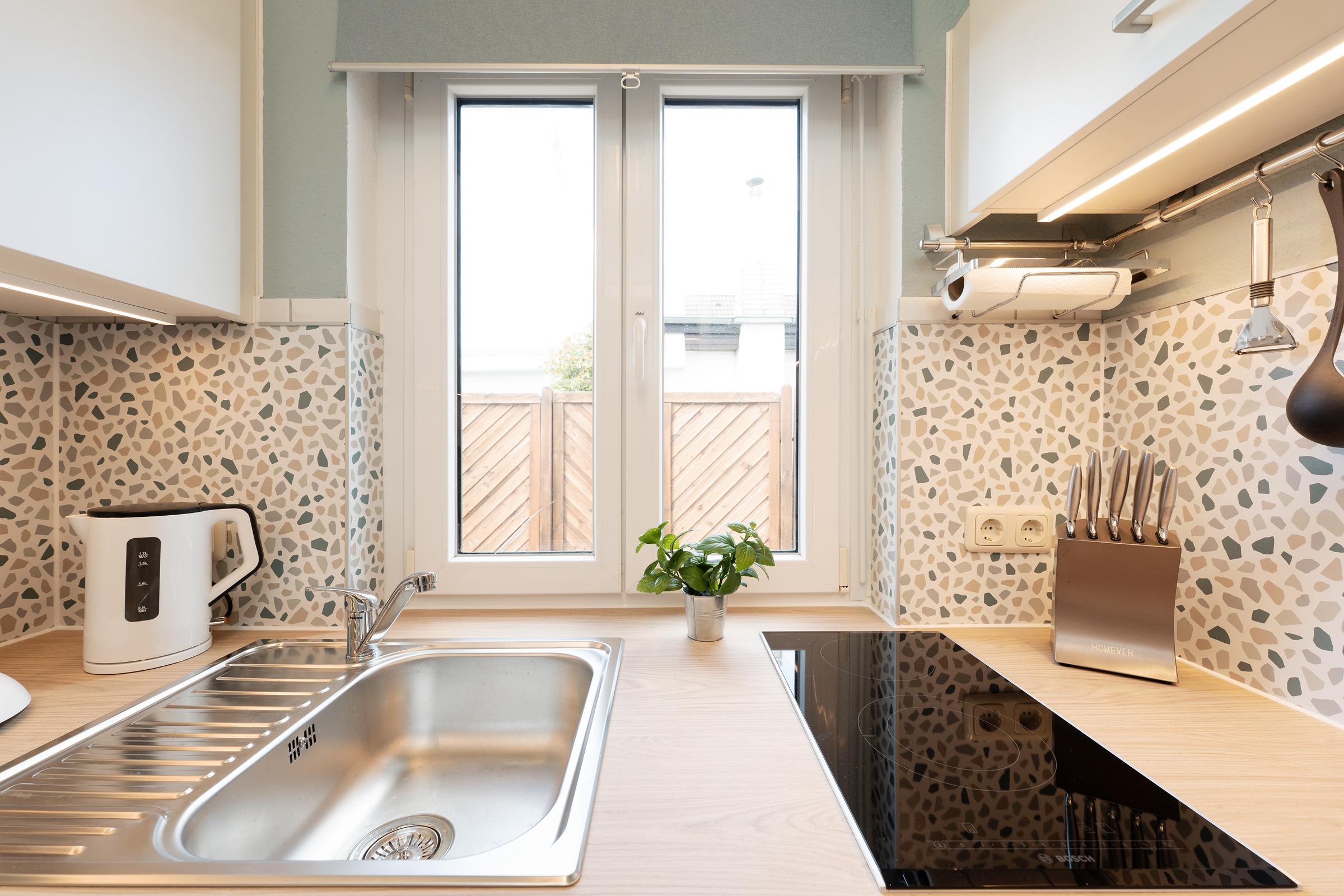 Die angrenzende Küche ist voll ausgestattet und bietet alles, was Sie für ein entspanntes Frühstück oder ein Abendessen nach dem Strandtag brauchen. Der lichtdurchflutete Wohnbereich mit kleinem Doppel-Schrankbett (ca. 160x200 cm) lädt zum Ausruhen ein – ob mit einem guten Buch oder bei knisterndem Feuer im Kaminofen.