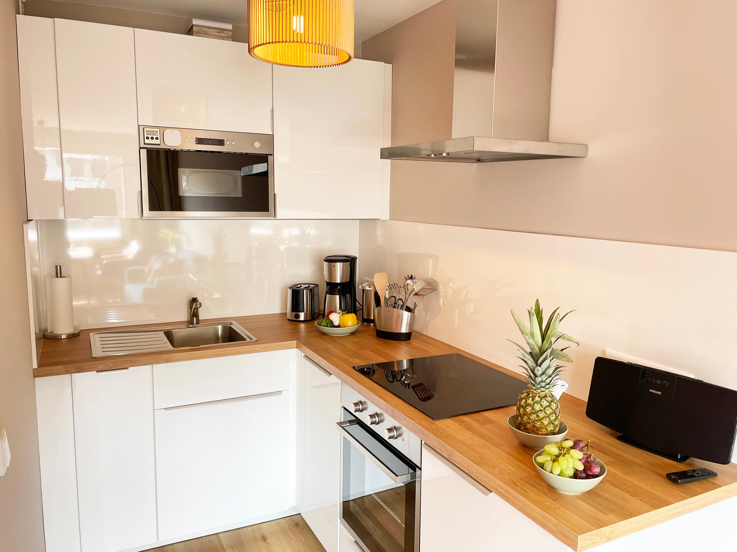 In der modernen und komfortablen Küche ist alles Wichtige vorhanden, hier macht Kochen Spaß! Die Küche wurde im Jahr 2022 eingebaut und komplett neu eingerichtet. Vom Teelöffel bis zu den Kochtöpfen ist hier alles neu. Neben Induktionskochfeld, Dunstabzugshaube, Backofen, Mikrowelle, Kühlschrank, Kaffeemaschine, Toaster und Wasserkocher finden Sie hier auch genügend Arbeitsfläche für die Zubereitung leckerer Gerichte.