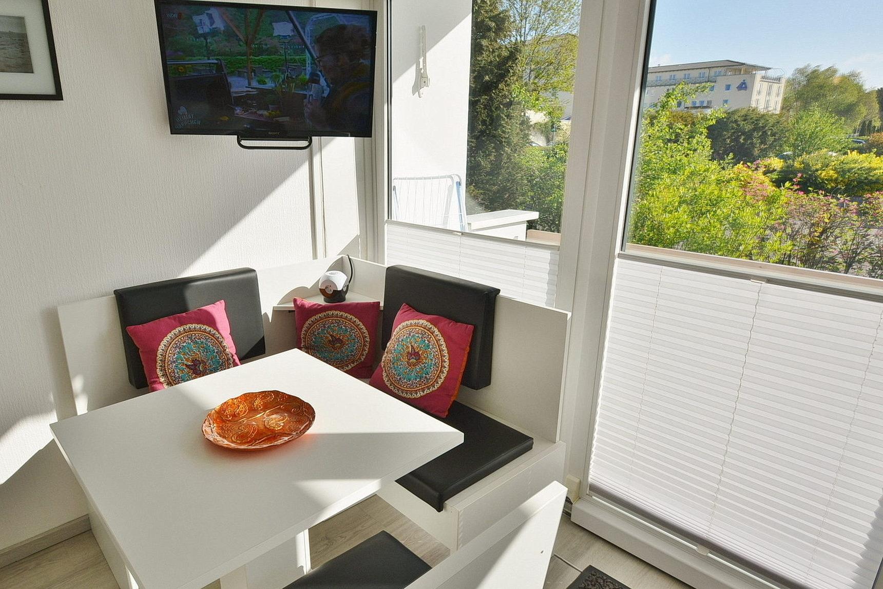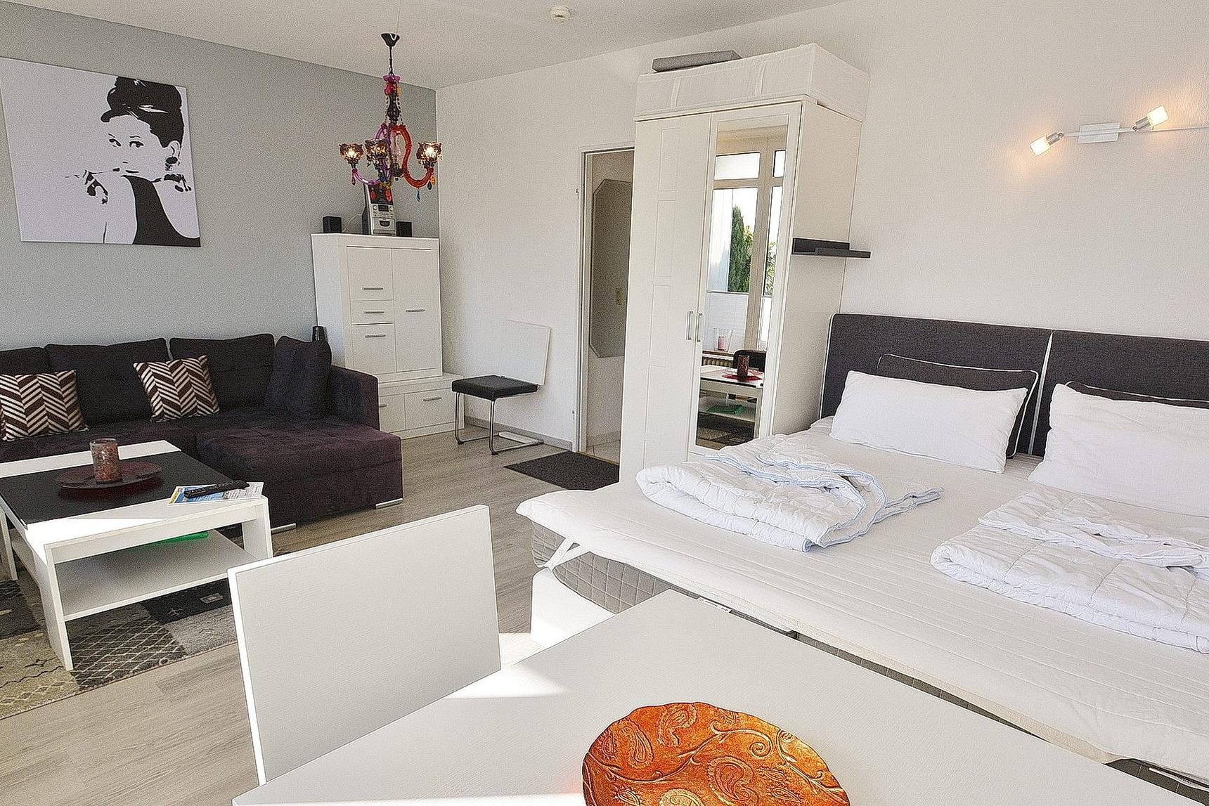 Modern ausgestattetes Wohn-/Schlafzimmer mit direktem Zugang zum Balkon in östliche Richtung. Das Wohn-/ Schlafzimmer ist mit einem Boxspringbett (180 x 200 cm), einem 2-türigen Kleiderschrank, einer kleinen Eck-Couch, einem Couchtisch, einem Essplatz für 4 Personen und einer Kommode ausgestattet. Zur Unterhaltung stehen ein Flachbildschirm (Kabel-TV) und eine Mini-Stereoanlage mit CD-Player zur Verfügung. Das Zimmer ist mit Laminat-Fußboden ausgelegt. Die Wohnung verfügt über Innenjalousien für Sicht- und Sonnenschutz. Eine komplette Abdunklung des Raumes wird dadurch nicht erzielt.